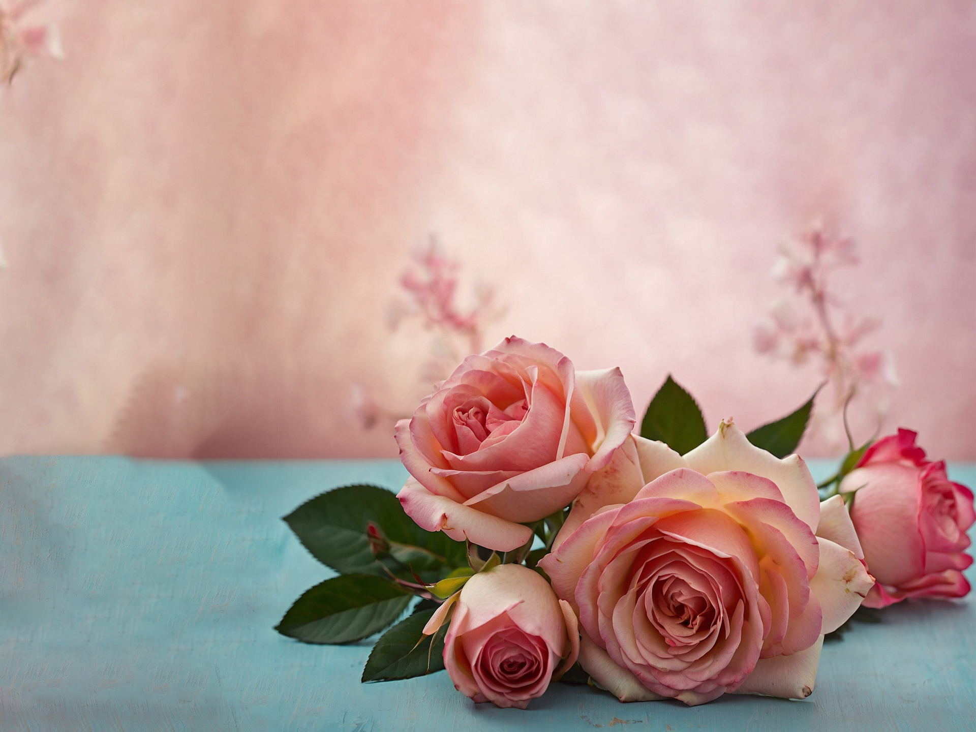 柔らかなブルーの木肌に、ピンクのバラが数輪、優しく生けられたブーケの静物画。