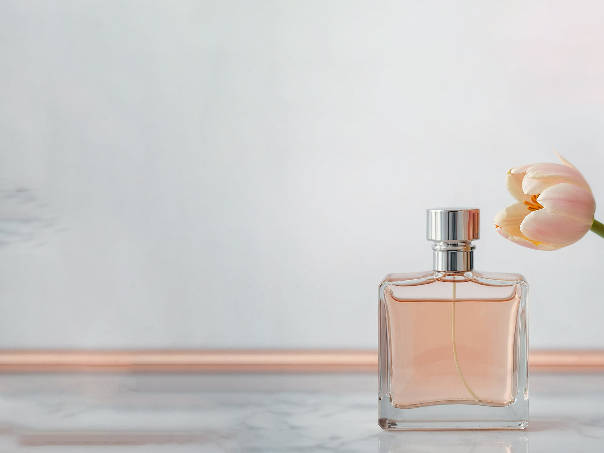 透明なガラスに洗練されたシルバーのキャップが付いた香水瓶が、大理石の表面に置かれたエレガントなスタイルの静物画。