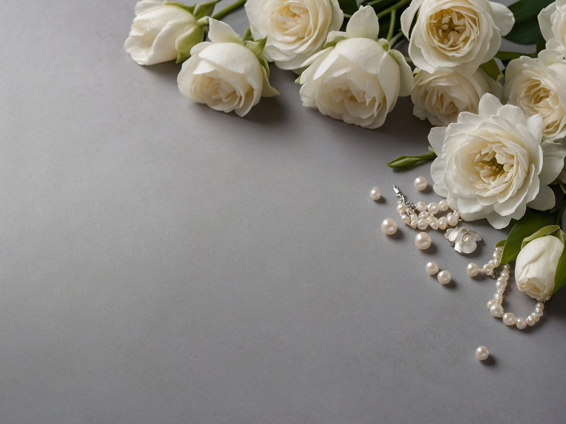 やわらかなグレーの背景に、白いバラとパールのジュエリーが美しく配置された静物画。