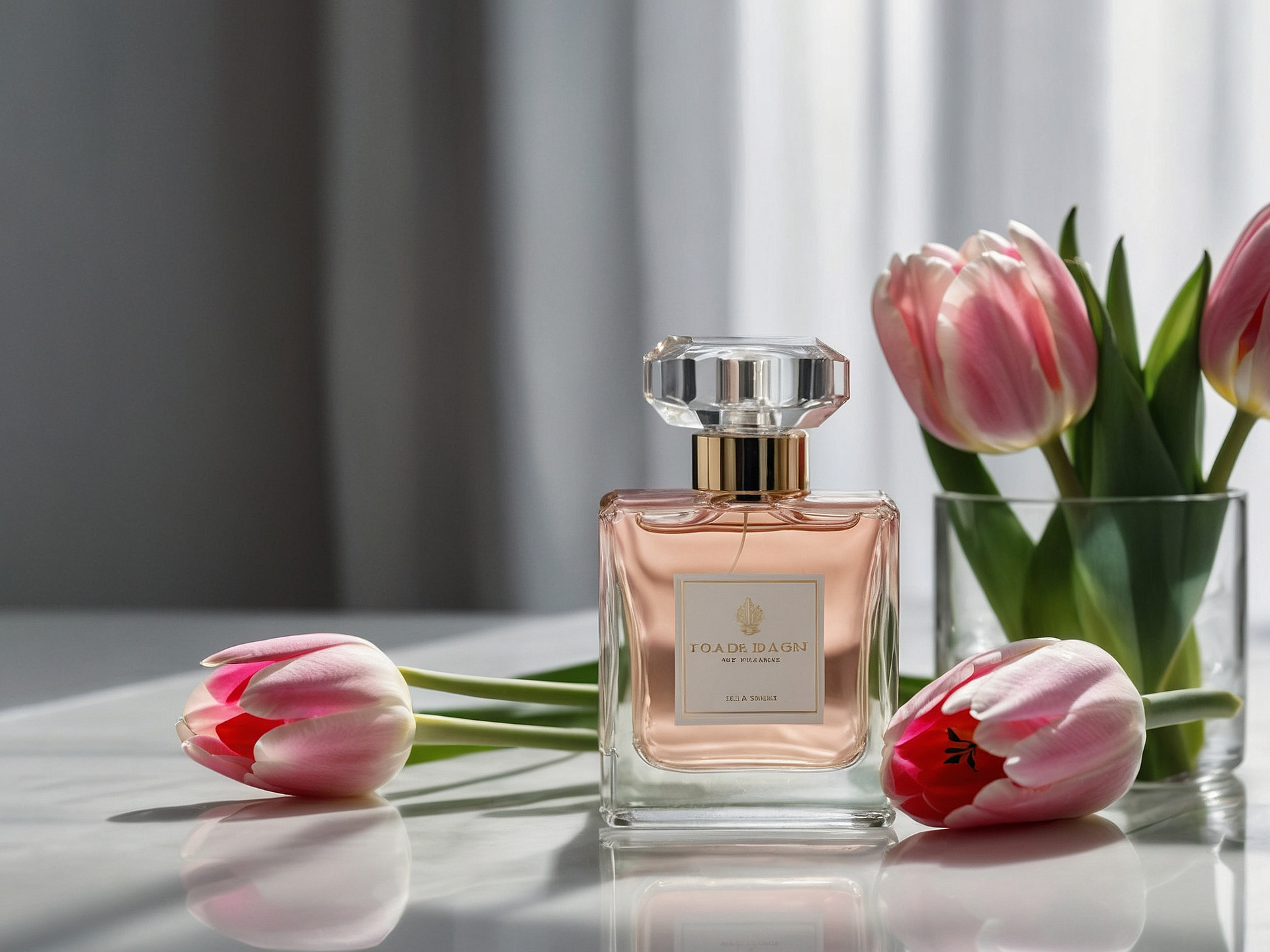 白い大理石のテーブルの上に、エレガントな香水瓶が芸術的に置かれた美しい静物画。