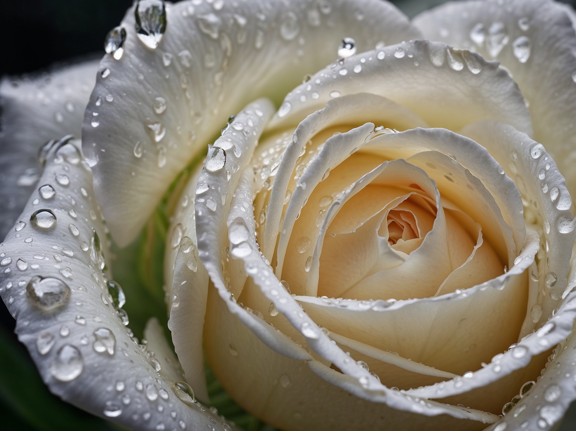 繊細な水滴(ディテール:1.5)が、絹のような花びらを際立たせています。柔らかく拡散した照明が、明るく幻想的な効果(照明:1.3)を生み出し、バラの自然な美しさを引き立てています。