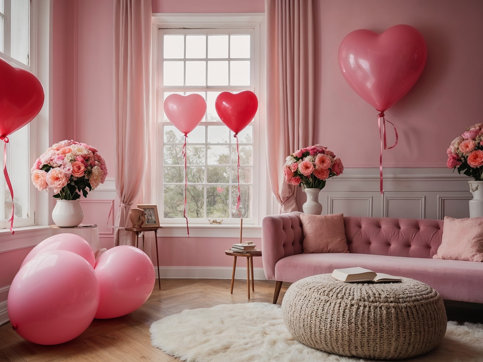 装飾には、ふかふかのピンクのソファ(スタイル:1.2)、優しいリボンで結ばれた大きなハート型の風船(色:1.2)、白い花瓶に生けられたパステルカラーのバラの花束などがあり、爽やかさを添えています。
