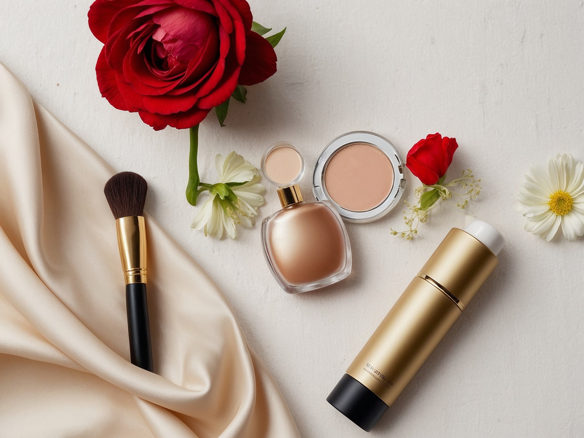 新鮮な花々と共に美容製品を際立たせた、魅惑的なフラットレイ構図。