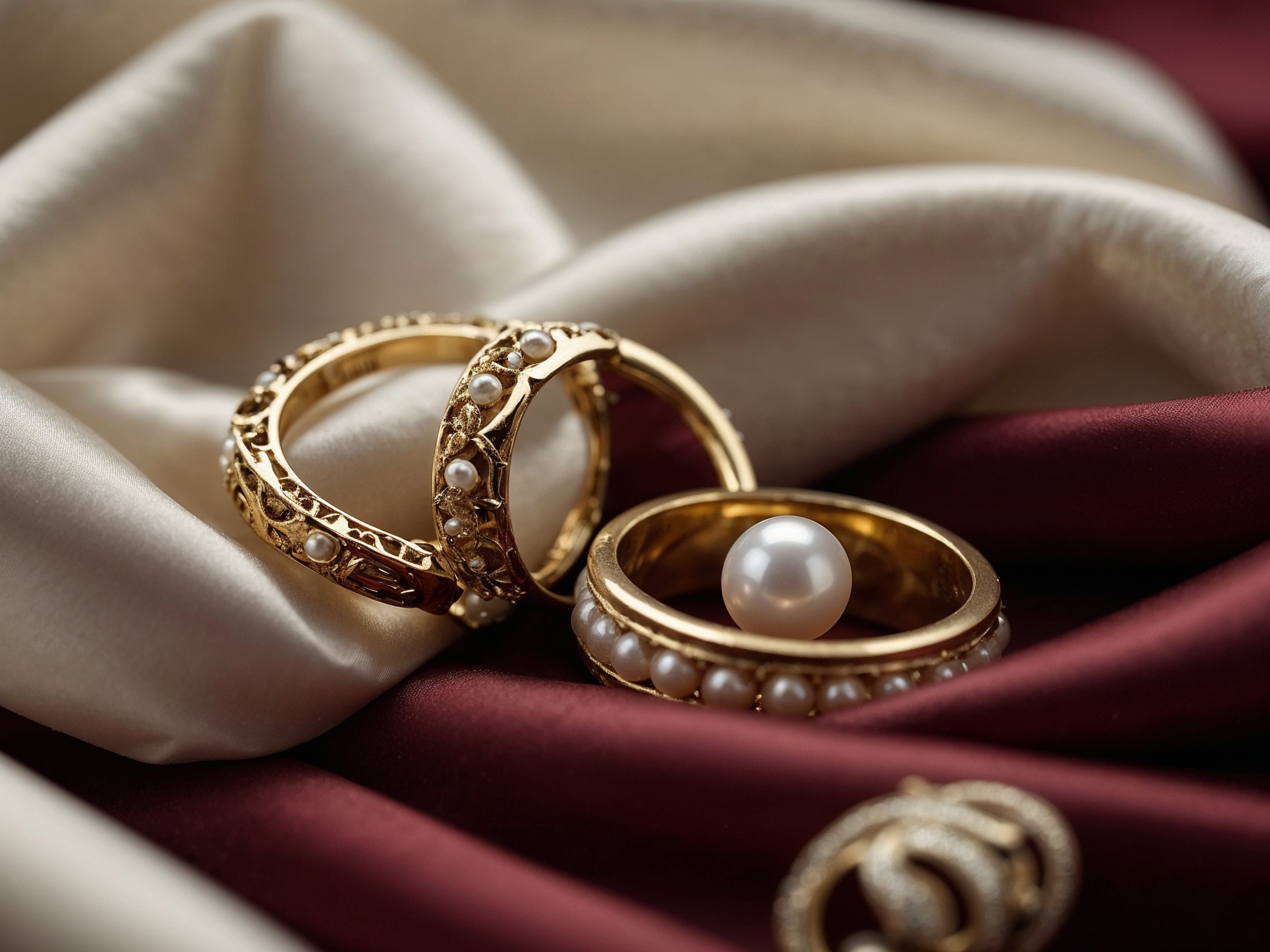 精巧なディテールと滑らかな質感が特徴の豪華な生地の上に置かれた 3 つのゴールド リングのエレガントなアレンジメント。