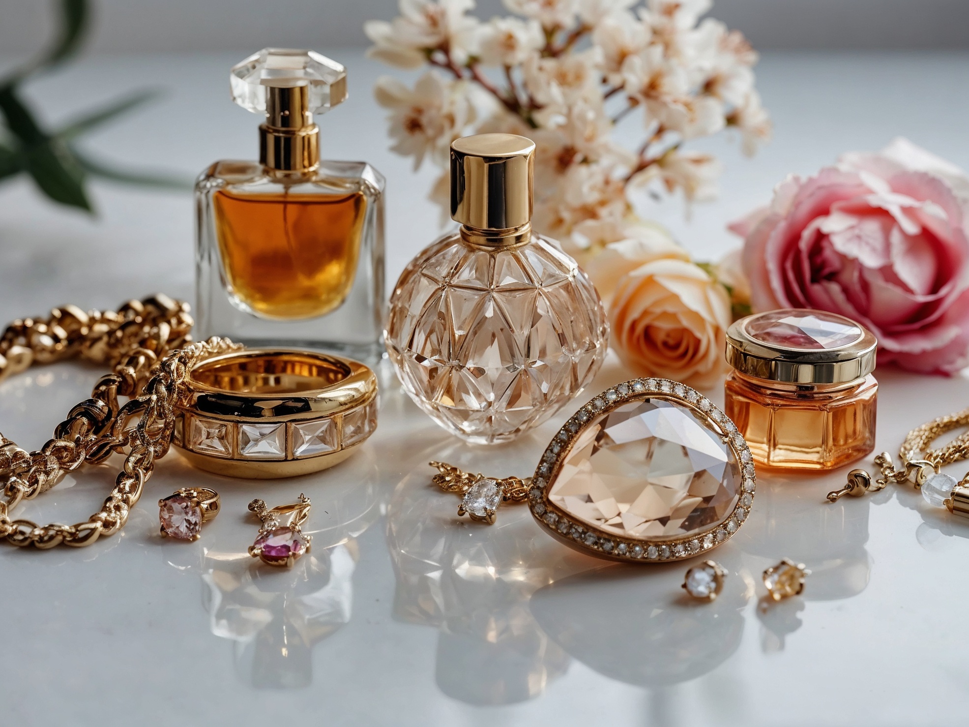 豪華な香水瓶、エレガントなジュエリー、繊細な花々を美しく配置した静物画です。