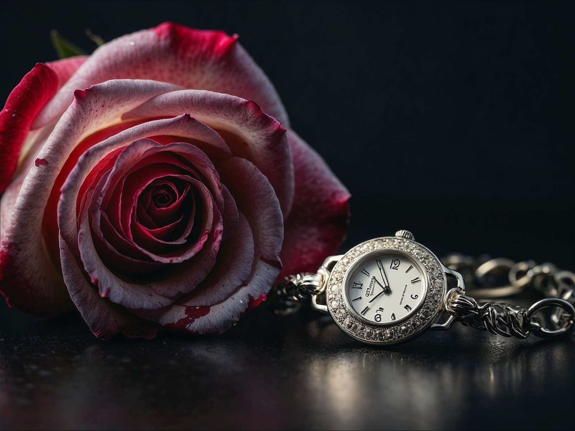 きらめく宝石で飾られた豪華なシルバーの腕時計を、半分開いたバラの横に優雅に配置。