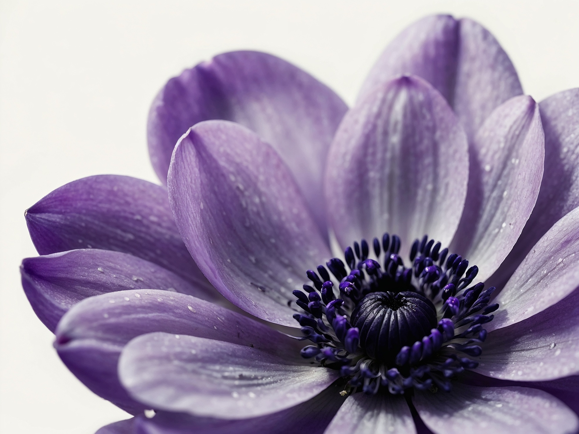 柔らかな自然光の中で、花びらに繊細な水滴がついた紫色のアネモネ(花:1.5)をクローズアップで捉えた、息を呑むような写真です。