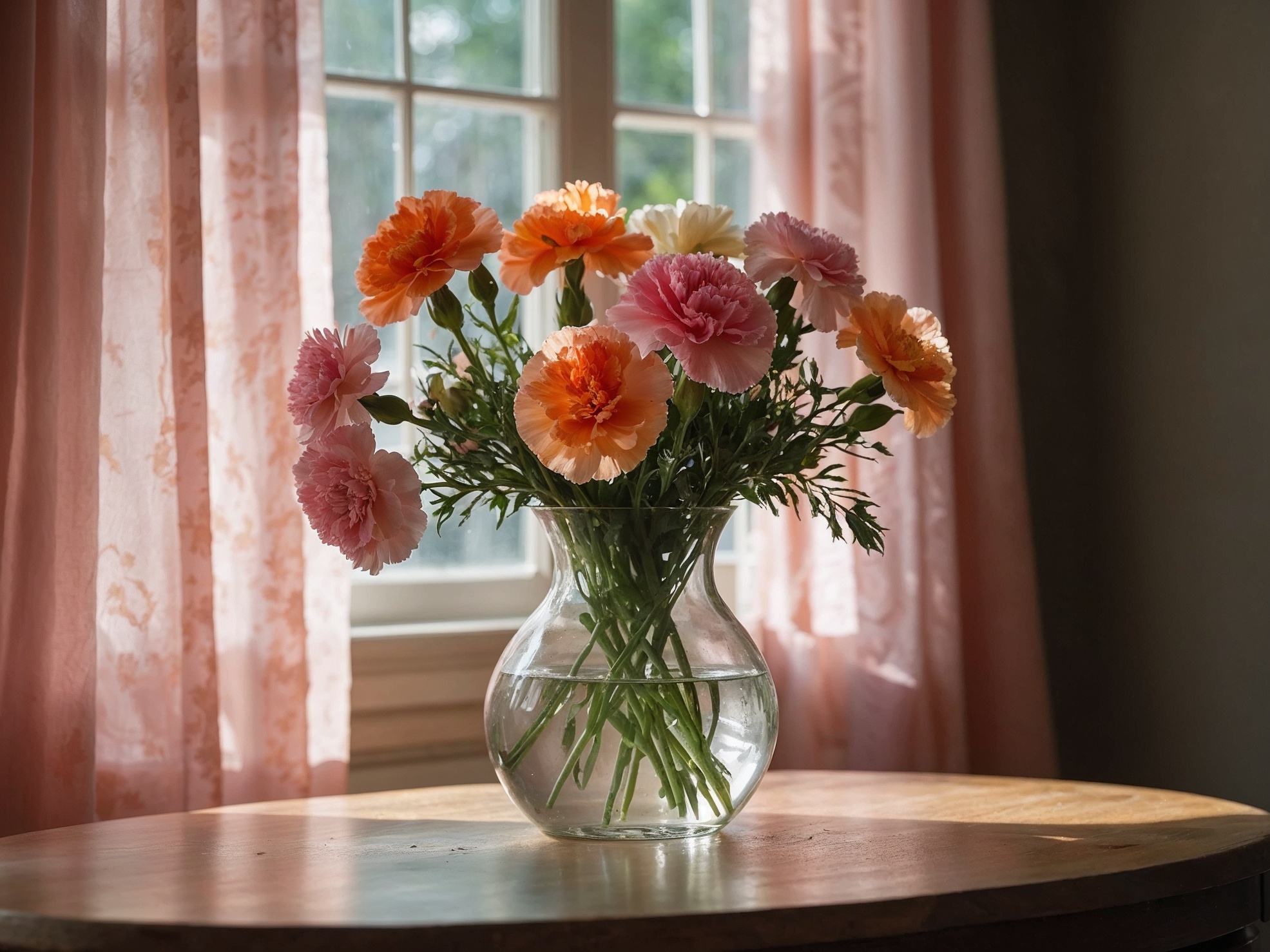 淡いピンクの丸いプレースマットの上に、ピンクやオレンジのカーネーションなど、鮮やかな花々が入った透明なガラスの花瓶が置かれた、静謐な室内風景です。