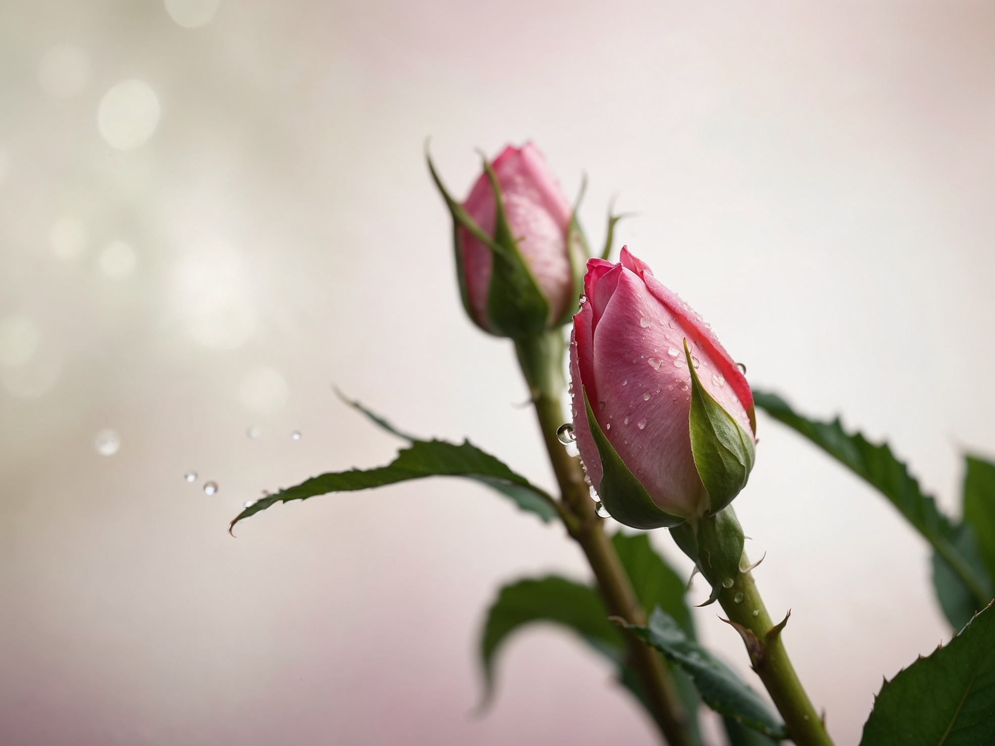 きらめく水滴に飾られたピンクのバラのつぼみを、柔らかく落ち着いた背景に繊細にクローズアップしました(ボケ:1.2)。