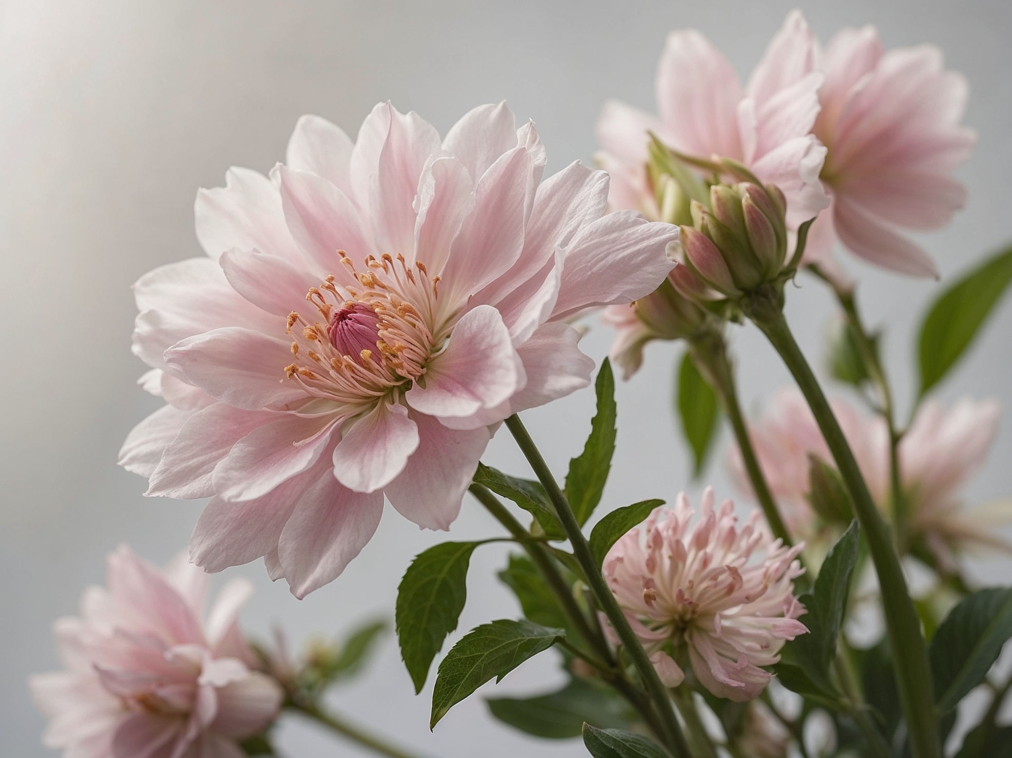 繊細なピンクの花のクローズアップ(強調度:1.2)は、複雑な花びらの構造と柔らかく幻想的な外観をしています。