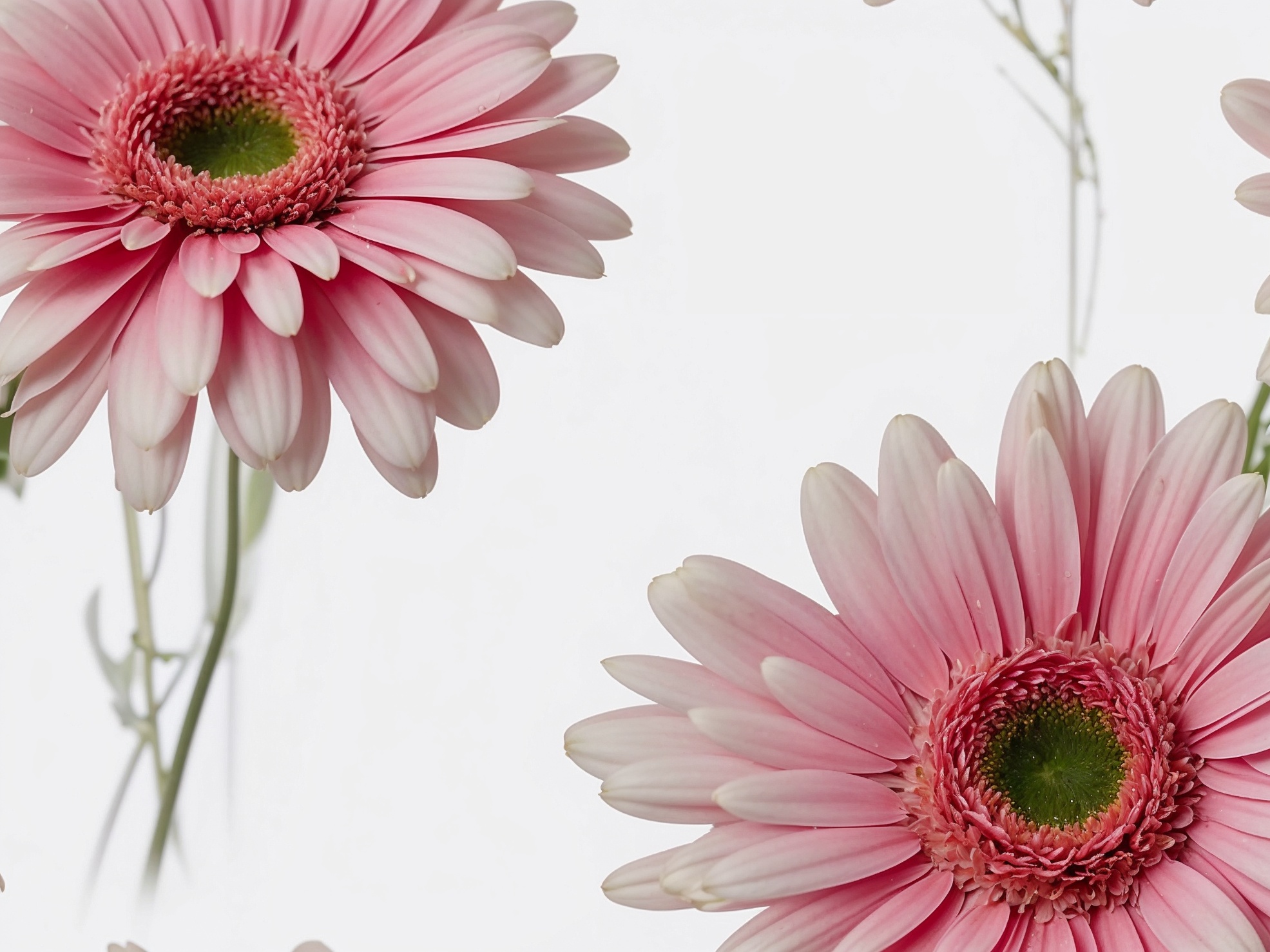 繊細なピンクのガーベラ(花:1.2)を柔らかく白い背景に巧みに配置したクローズアップ構図。