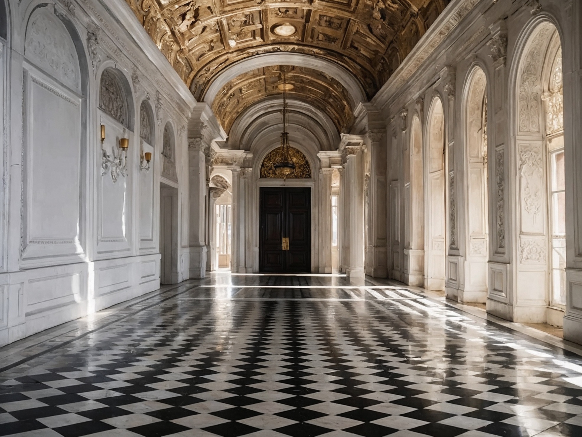 広角で撮影し、光と影のバランスに重点を置き、廊下の対称性と奥行きを強調しています(構図:1.2)。