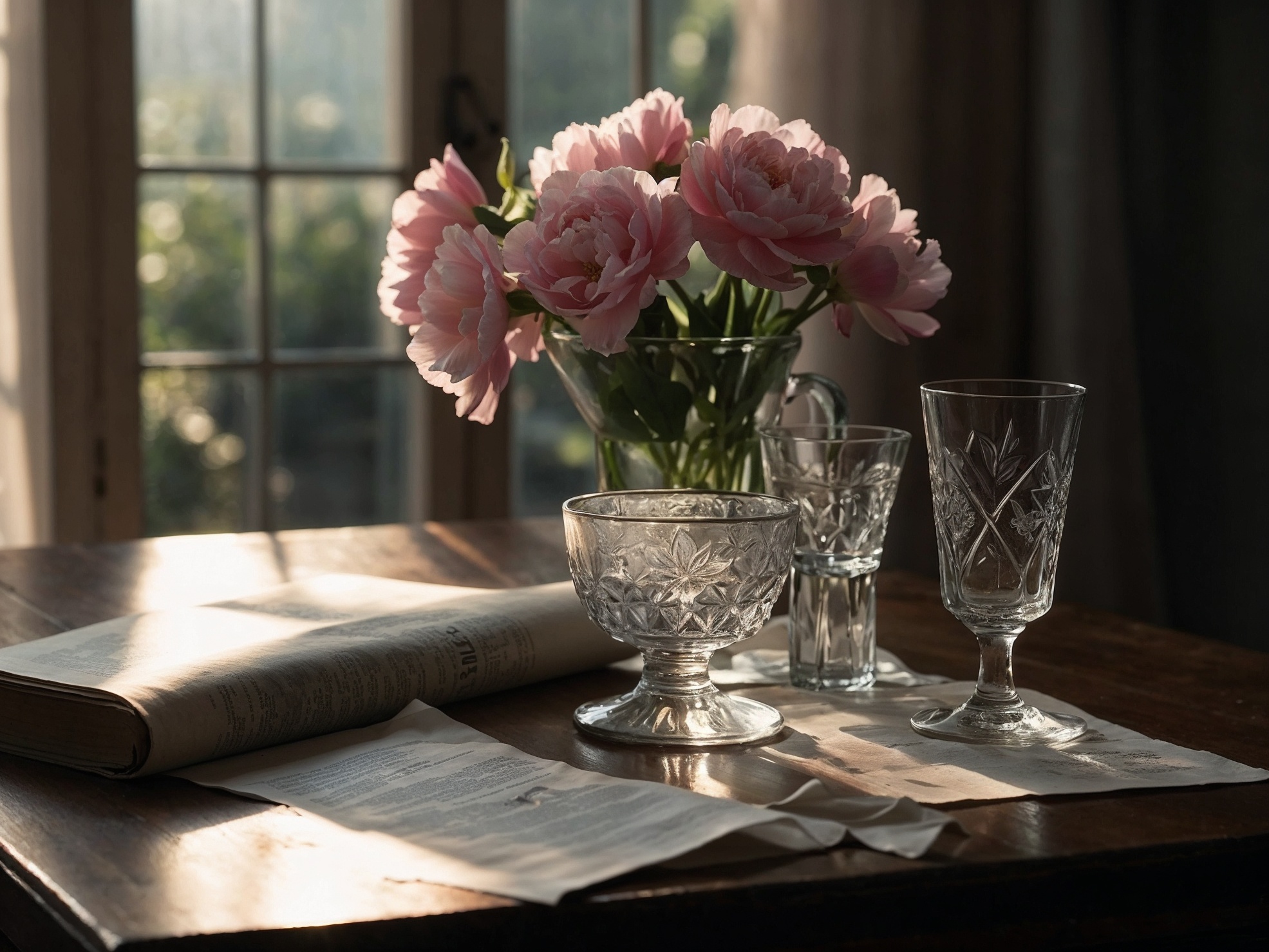 静謐な静物画。木製のテーブルの上に、サイズとデザインの異なる3つのクリスタルグラスと、ピンクの牡丹が飾られた花瓶が置かれています(花:1.2)。