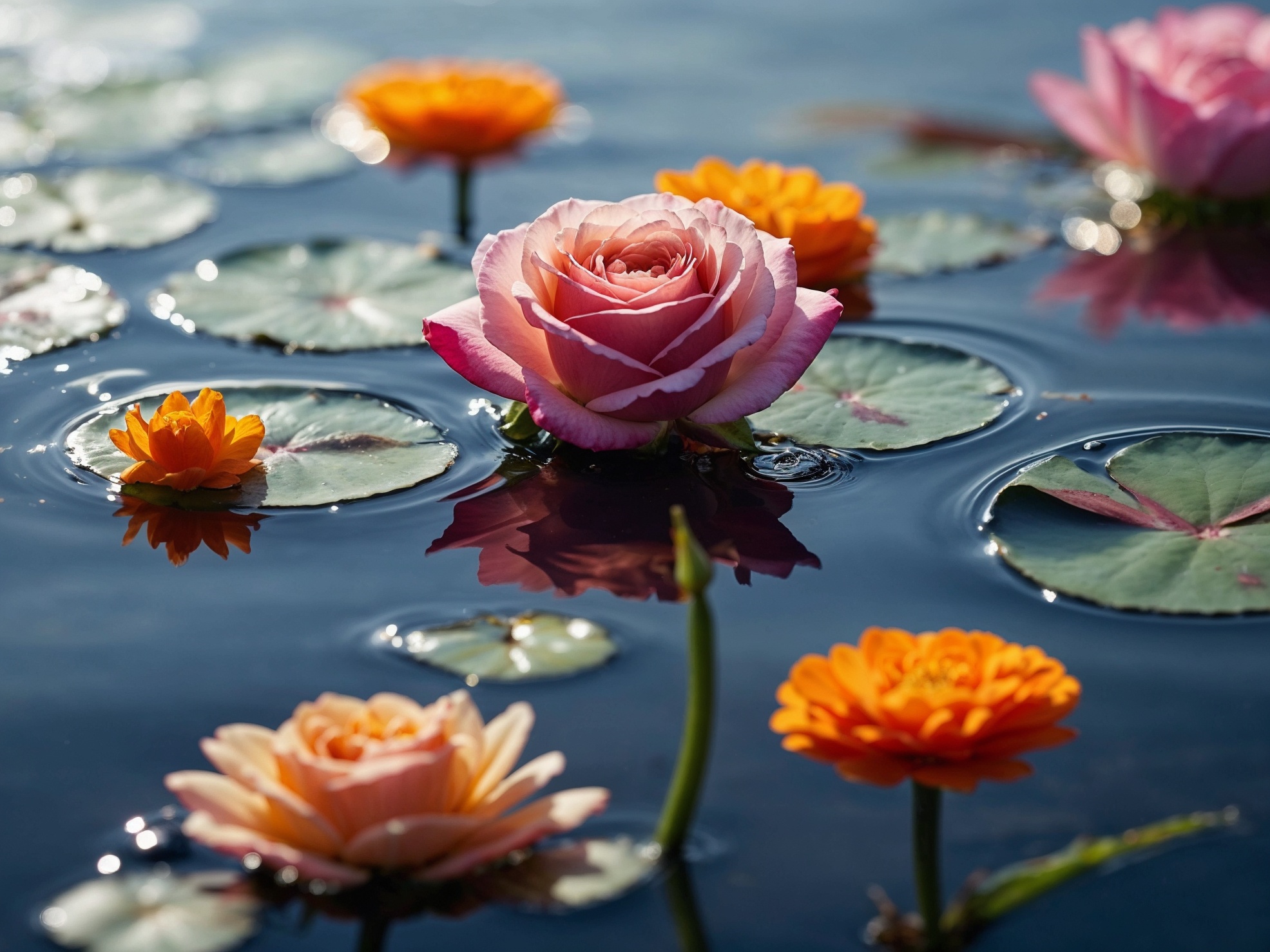 様々な大きさと色の睡蓮が豊かに咲き誇り、中央には淡いピンクのバラ(花:1.2)が鮮やかに咲き、その周囲には鮮やかなオレンジ色のマリーゴールドと、桃色の小さな花々が咲いています。