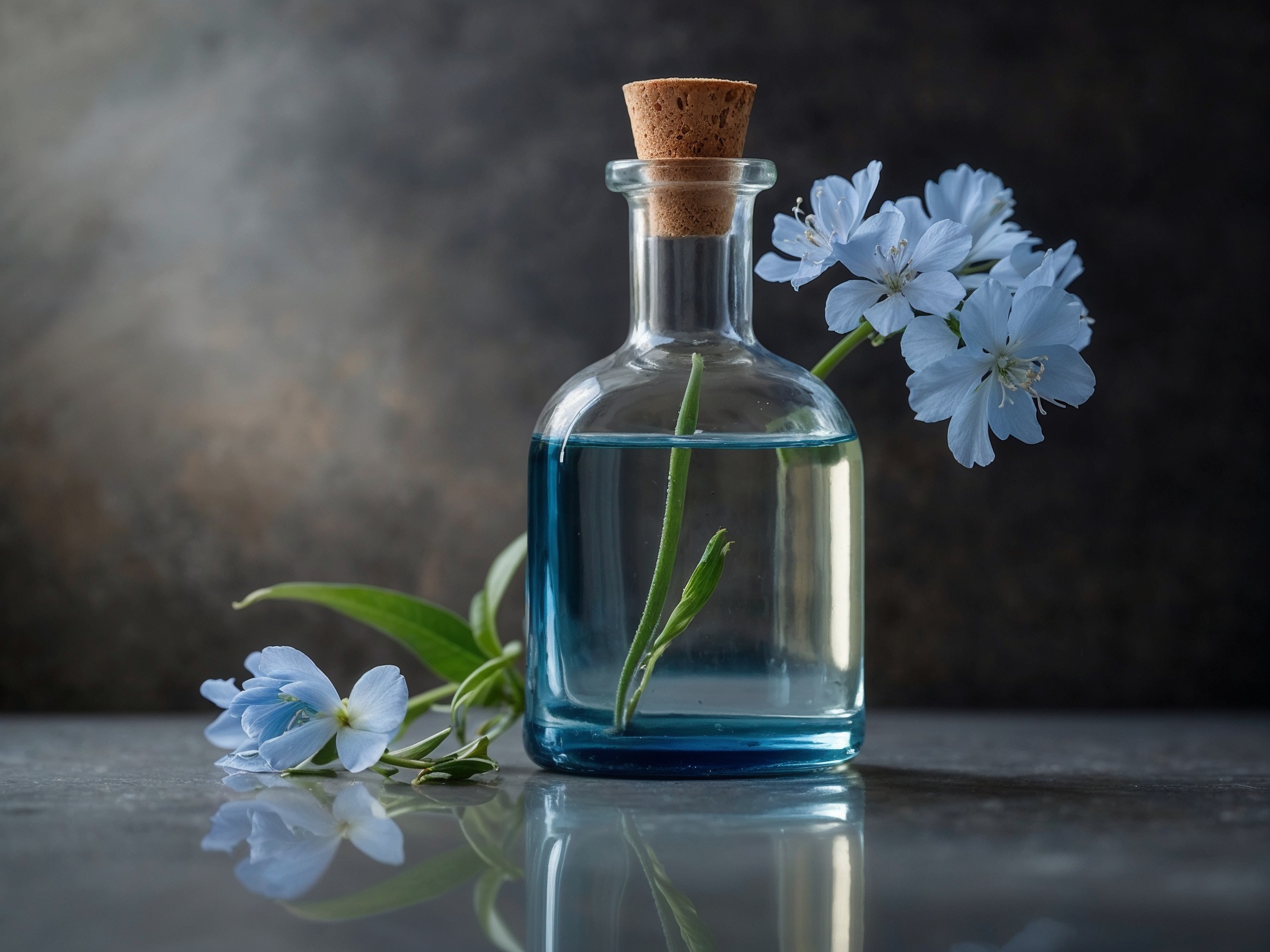 瓶には、繊細な青い花が2本、優雅に寄りかかっており、緑の葉が絡み合ってコントラストを高めています(鮮やかな色彩:1.2)。