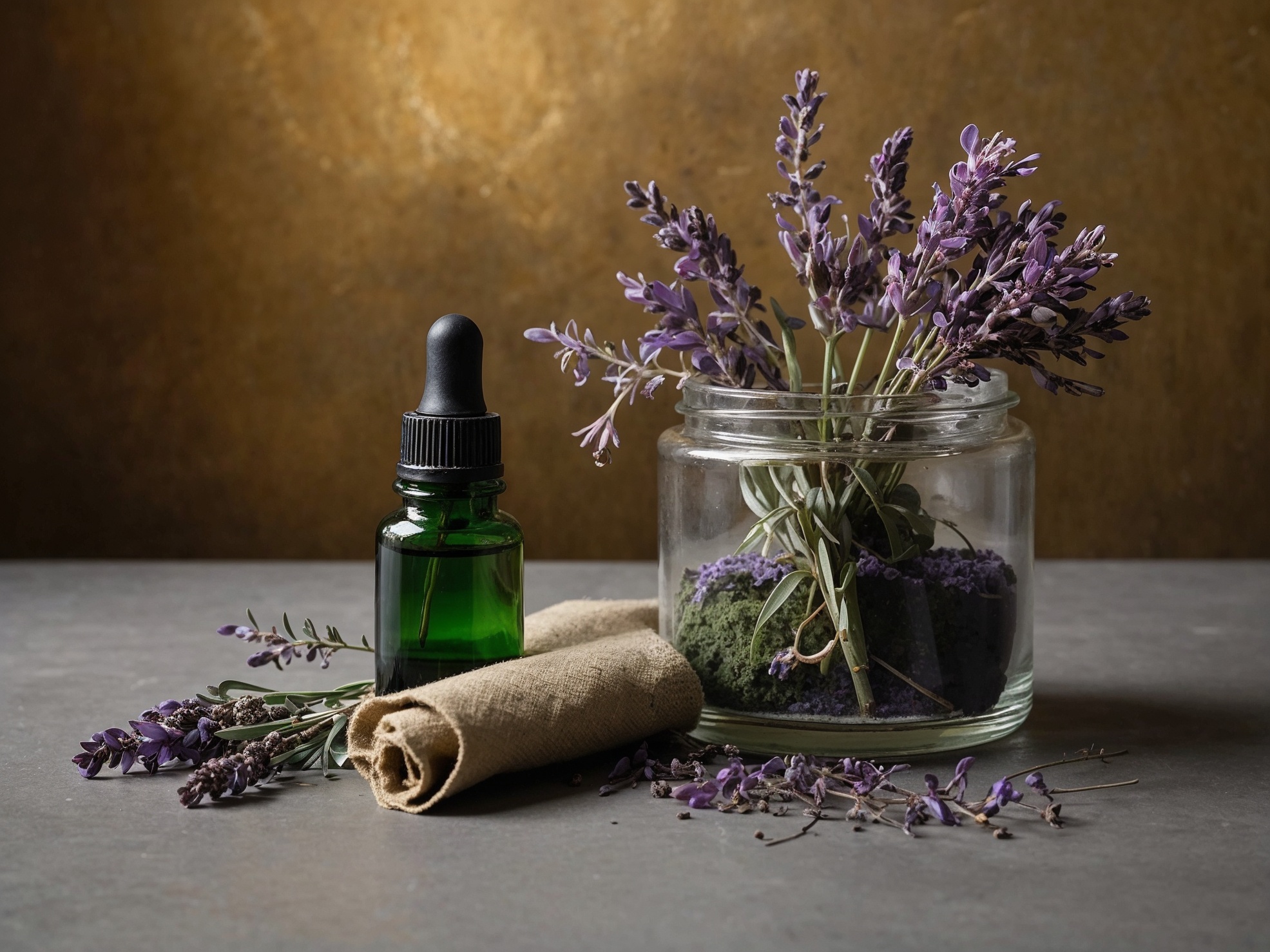瓶の横には、濃い緑色のガラス製スポイトボトル(キーワード:1.2)が置かれ、黒いキャップが柔らかな周囲光を反射しています。