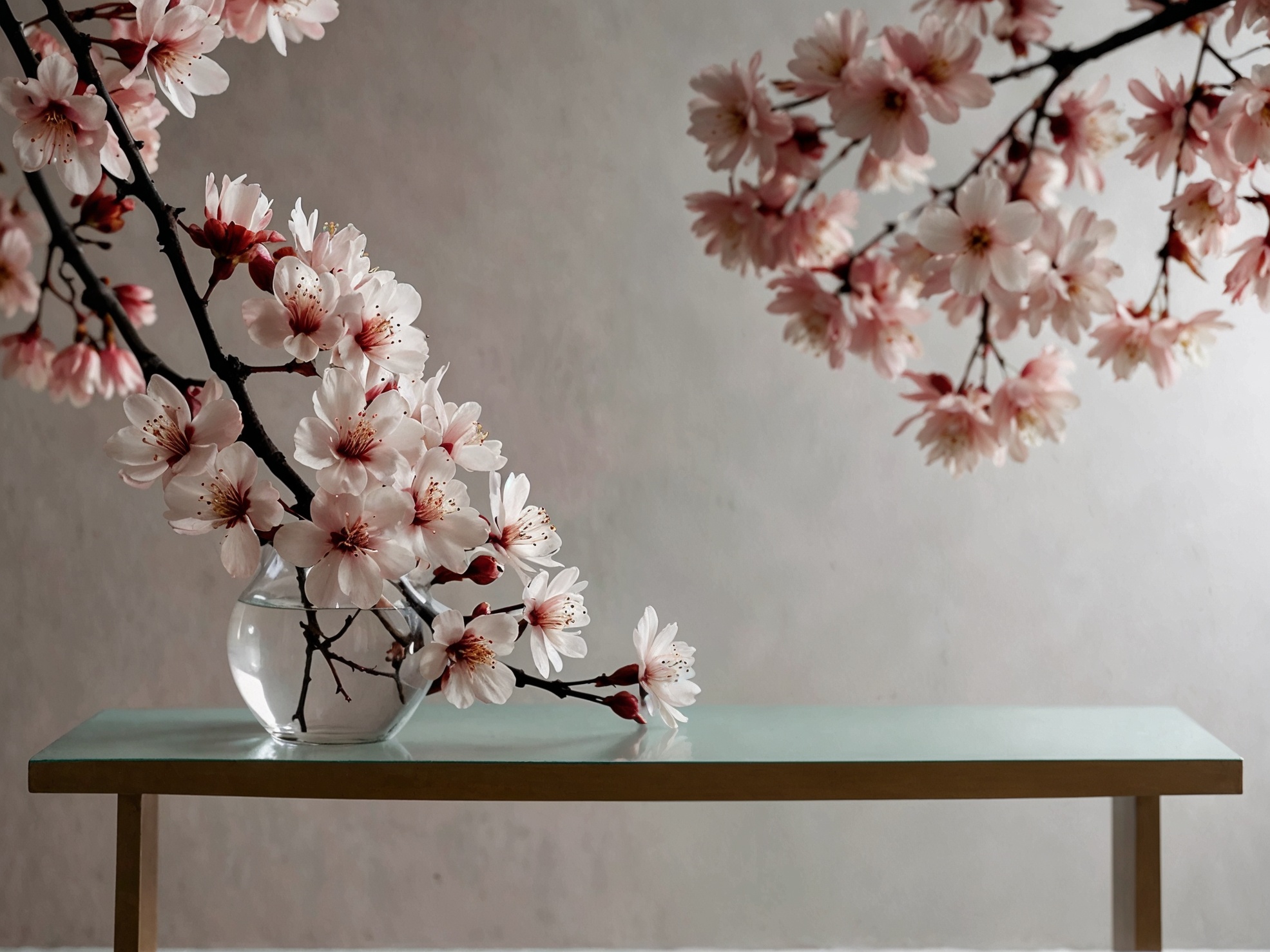 淡いピンクの花を添えた繊細な桜の枝を、水を満たした透明なガラスの花瓶に優雅に生けた、静寂に満ちた静物画です。