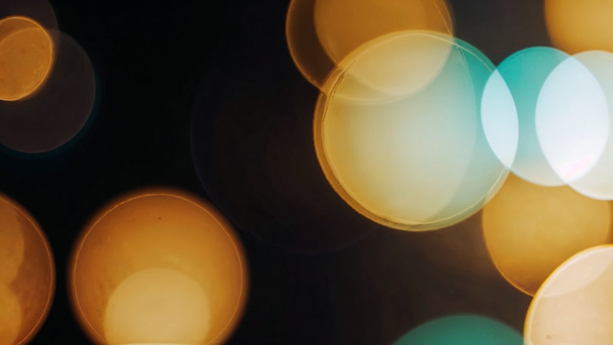 ゴールド、ティール、ウォームホワイトの色合いで、鮮やかなボケの光を際立たせた抽象的な画像。