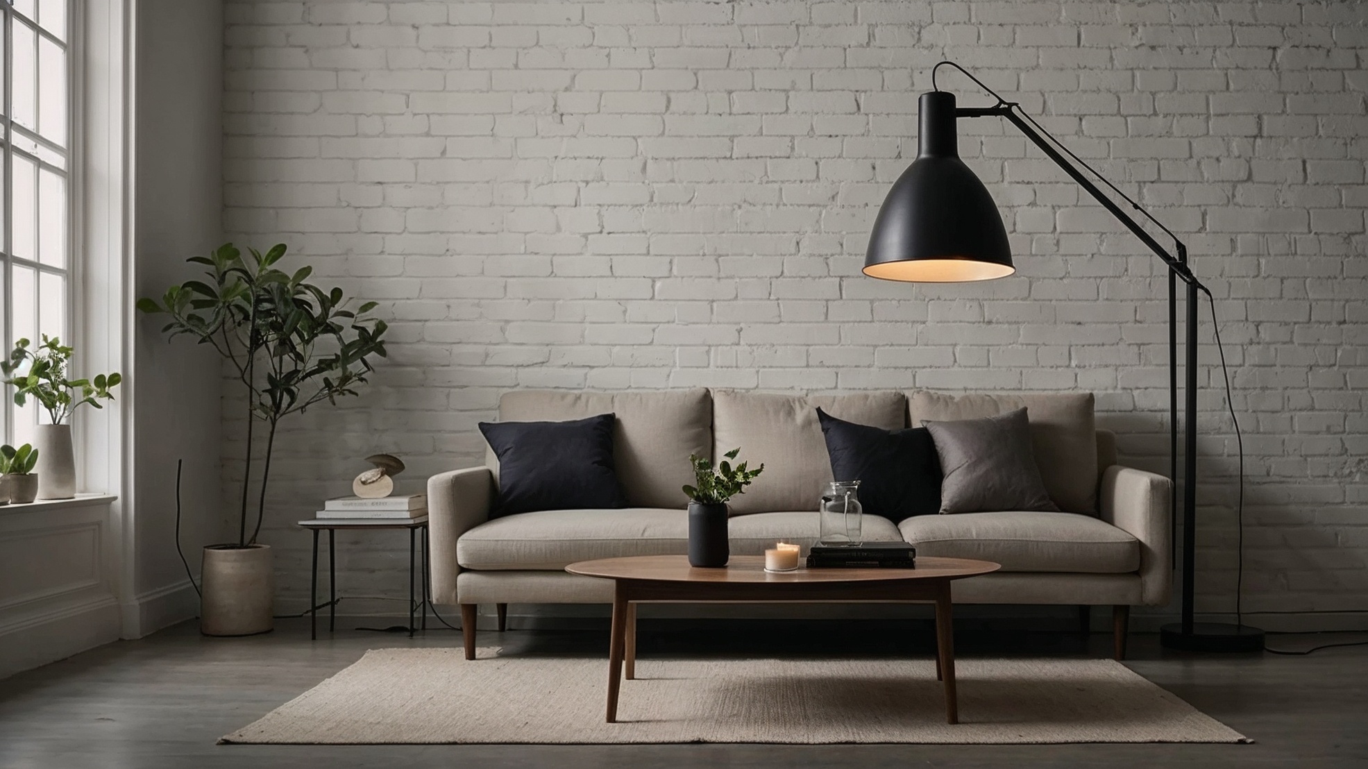 明るいレンガの壁を背景に、ダークカラーのクッションが飾られた居心地の良いベージュのソファ、そして温かみのある木製のコーヒーテーブルが置かれた、モダンでミニマルなリビングルームの風景です。