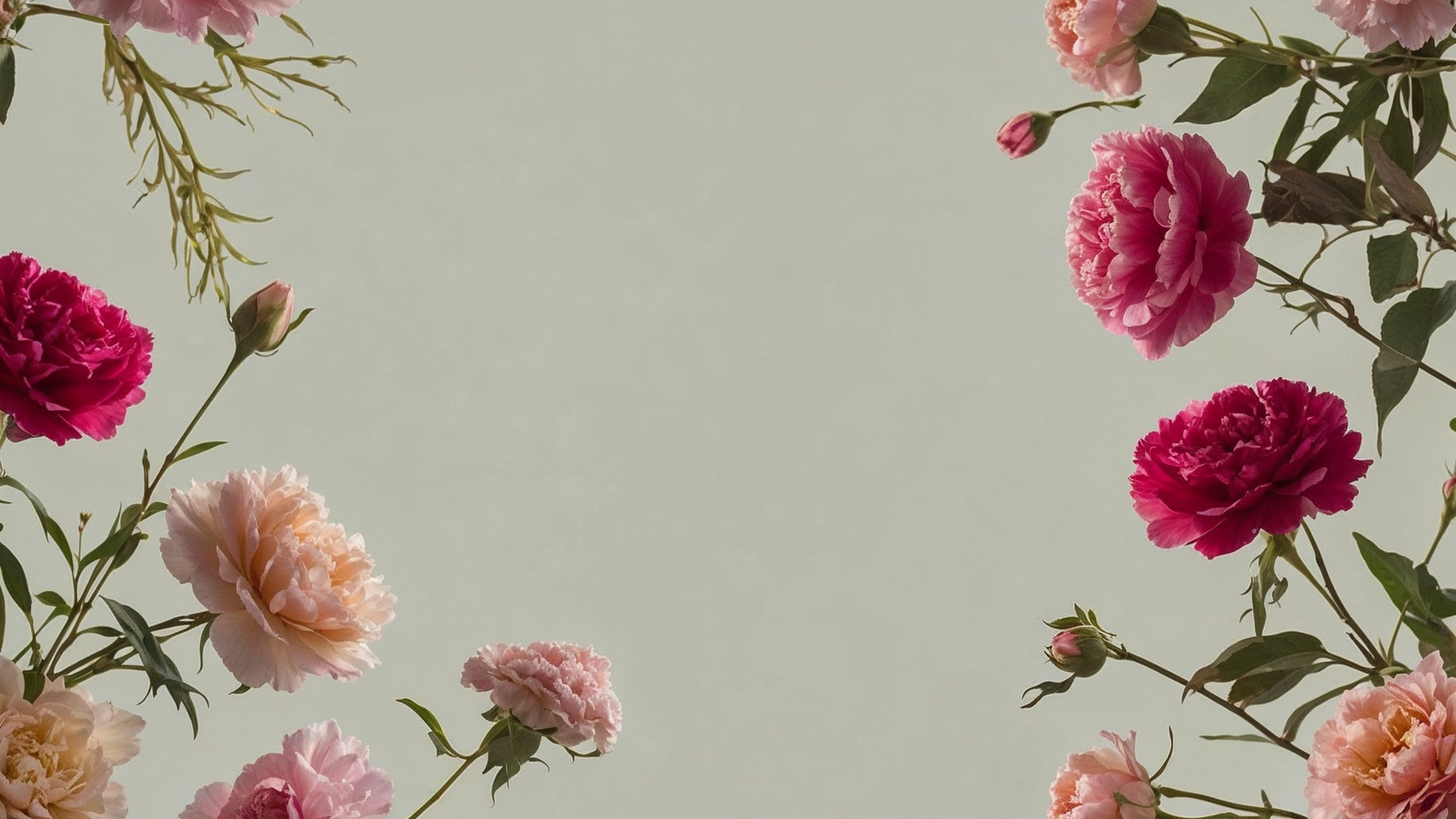 ピンクや赤の牡丹、カーネーションなど、色とりどりの花々を、柔らかく落ち着いた緑の背景に、四隅に芸術的に配置した、静謐な花の構図です。