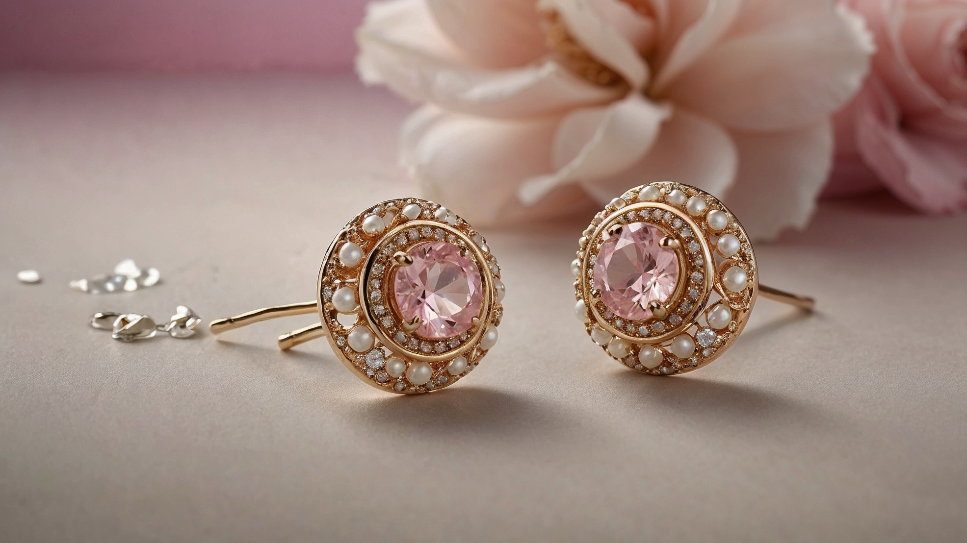 イヤリングは繊細なデザインで、中央のピンクの宝石を繊細なパールと小さな輝く石が取り囲み、エレガントな(フォーカス:1.2)構図を生み出しています。