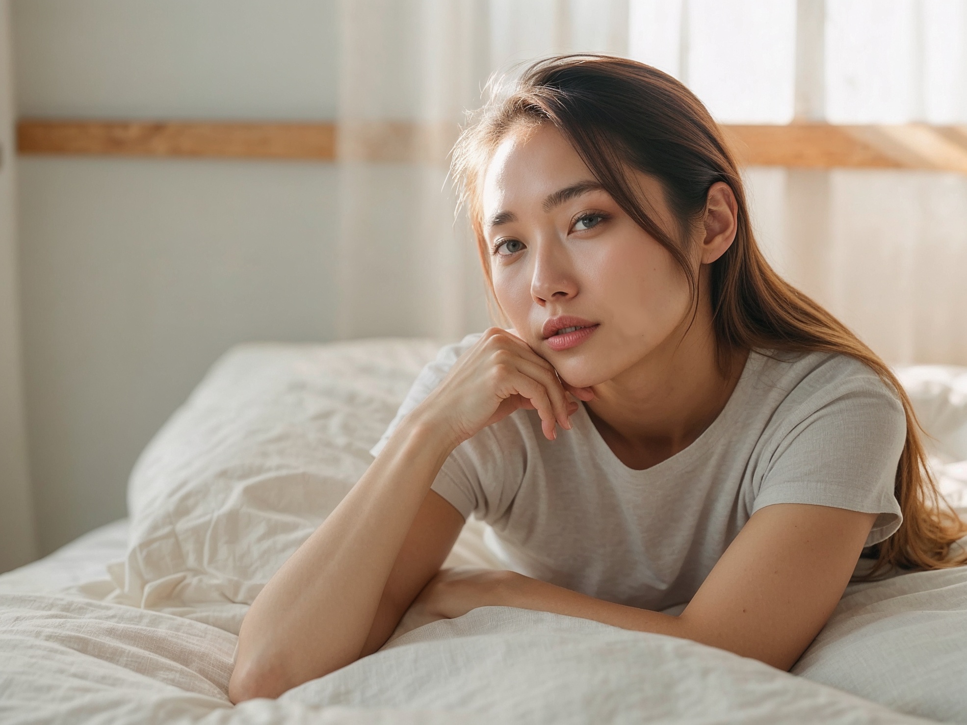 穏やかな室内の風景。長く流れるような髪の若い女性がベッドの上で思慮深くポーズをとっています。