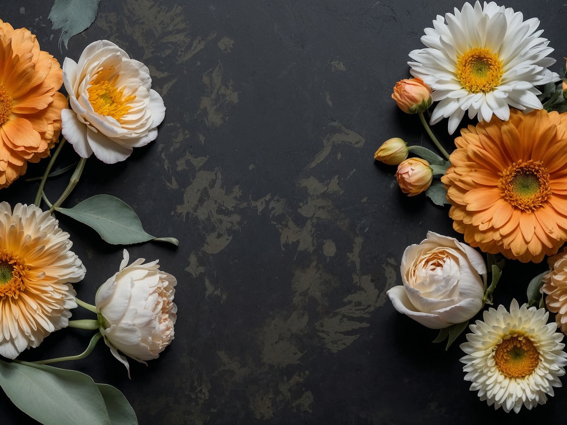 白いシャクヤク、オレンジ色のガーベラ、白いデイジーなど、様々な花々を、質感のあるダークグレーの背景に美しくアレンジしたフラットレイです。