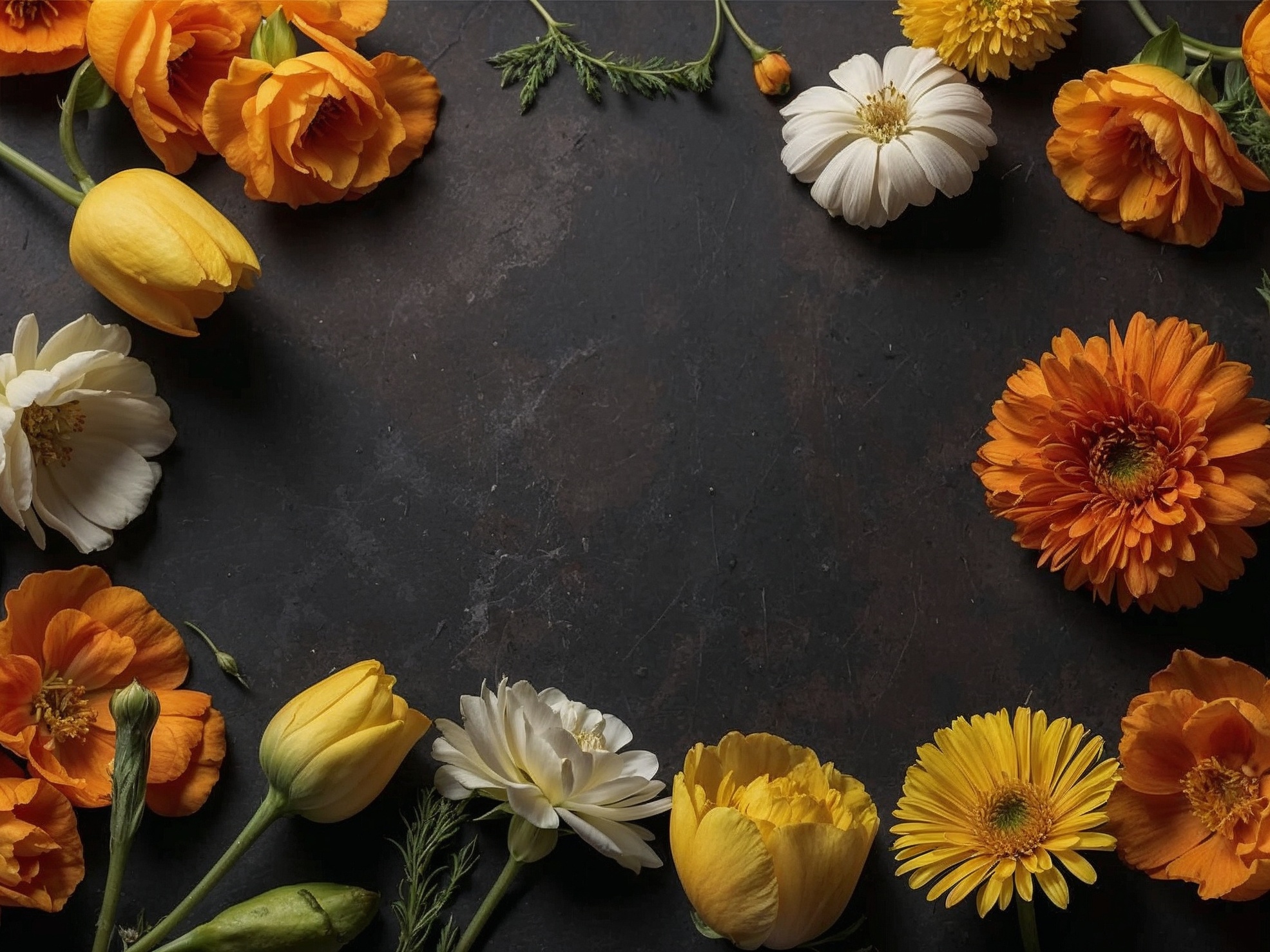 花々は画像の周囲に巧みに配置され、自然な境界線を作り出し、何もない暗いスレートの背景を強調することで、奥行きとコントラストを加えています。