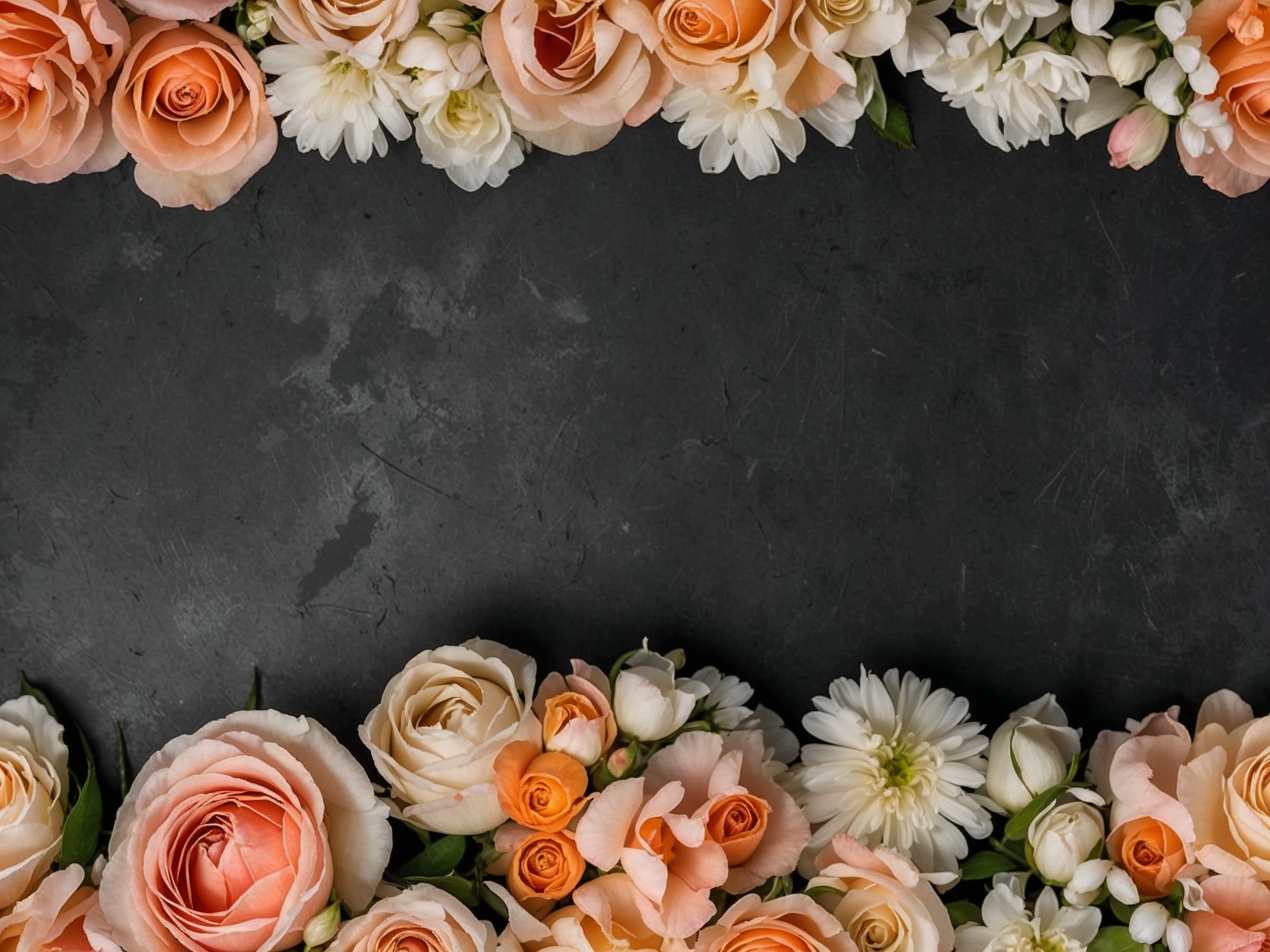 柔らかなピーチと白のバラを、ダークな質感の背景に優雅にアレンジした、視覚的に魅力的な構図です。