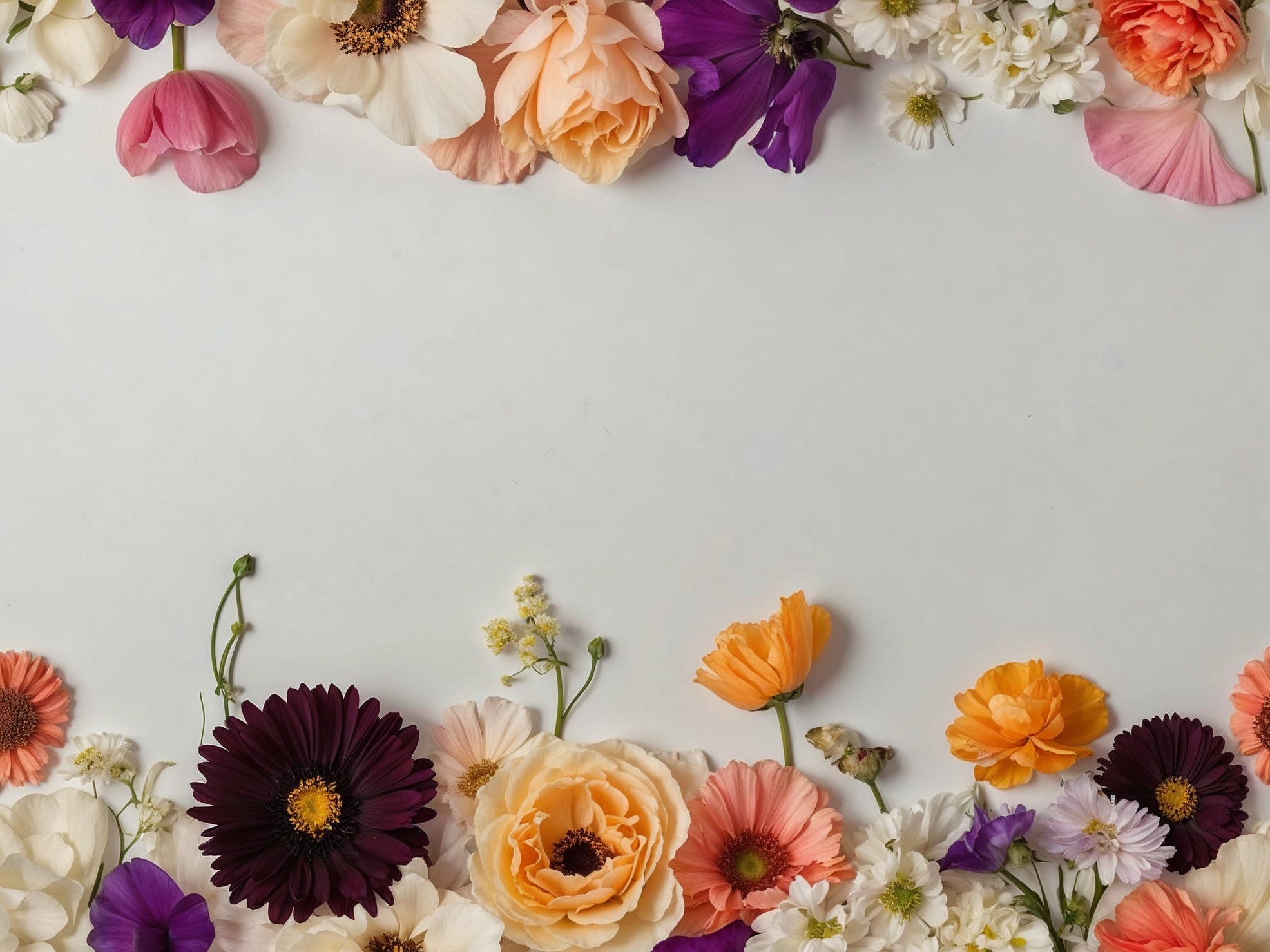 シャクヤク、デイジー、ガーベラなど、様々な花々が柔らかな白い背景の縁に沿って美しく配置された、生き生きとした構図です。