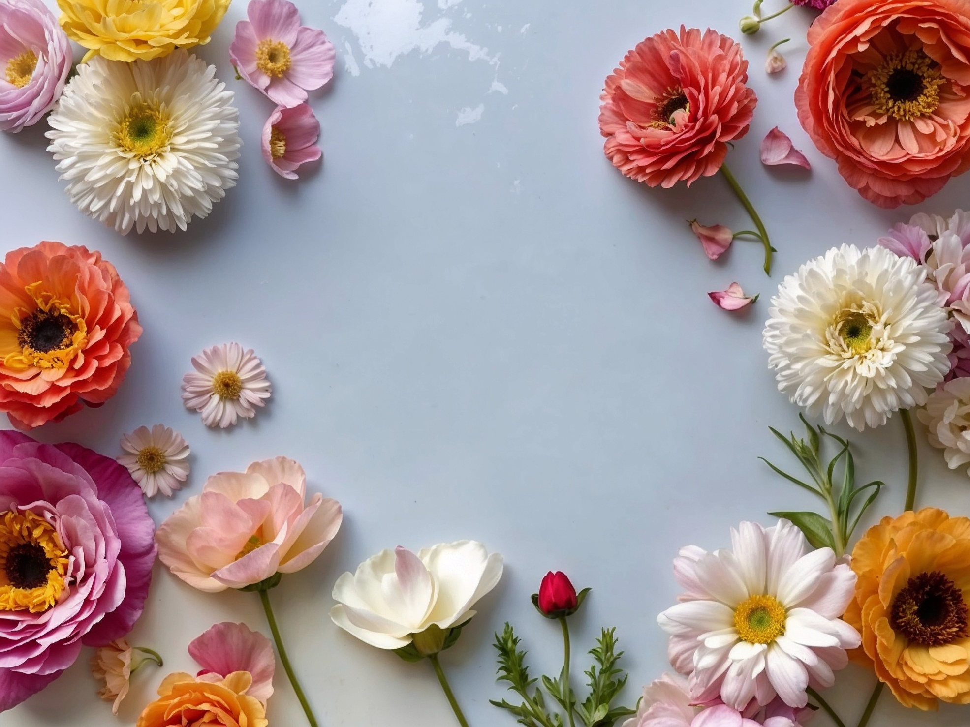 鮮やかな色合いと精緻なフラットレイ構図。シャクヤク、ラナンキュラス、デイジー、アネモネを滑らかな白い背景に美しく配置。