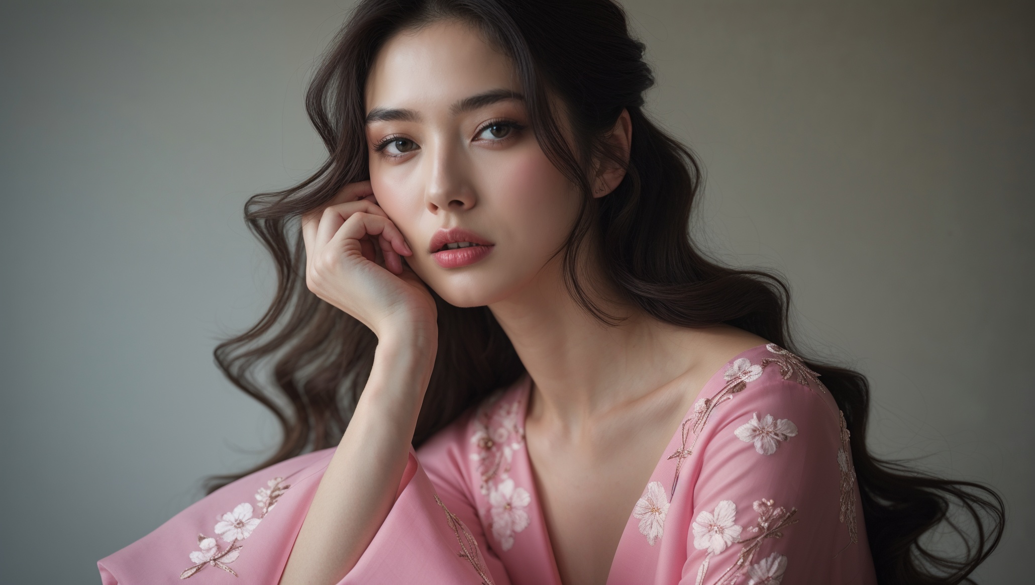 彼女の手は優雅なポーズで、片方は肩に置かれ、もう片方は優しく組まれています。画像からは優雅さと落ち着きが感じられ、美しさと女性らしさが強調されています。