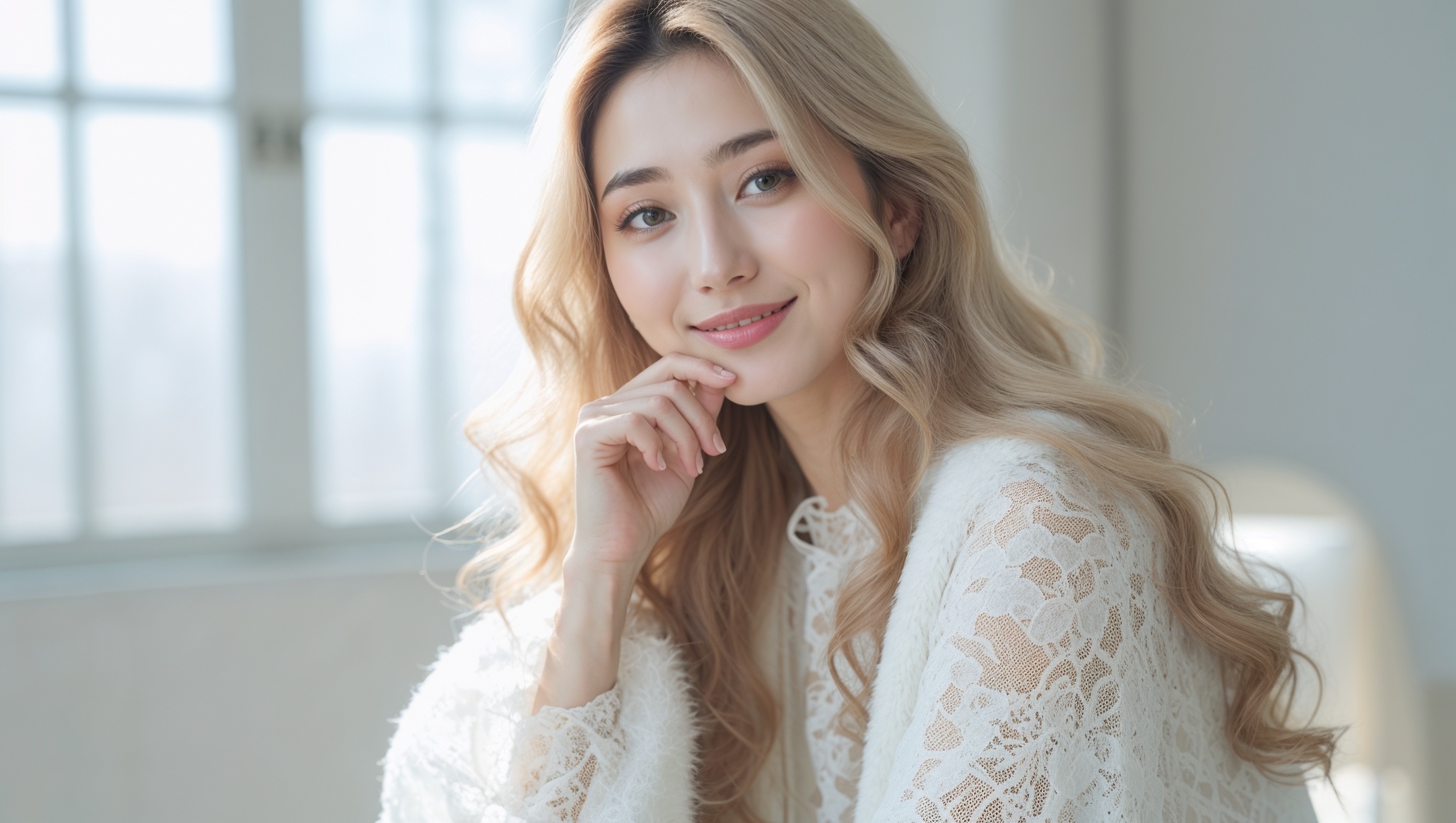 彼女は清潔感のある柔らかな白い背景を背景に、顔立ちが強調されています。