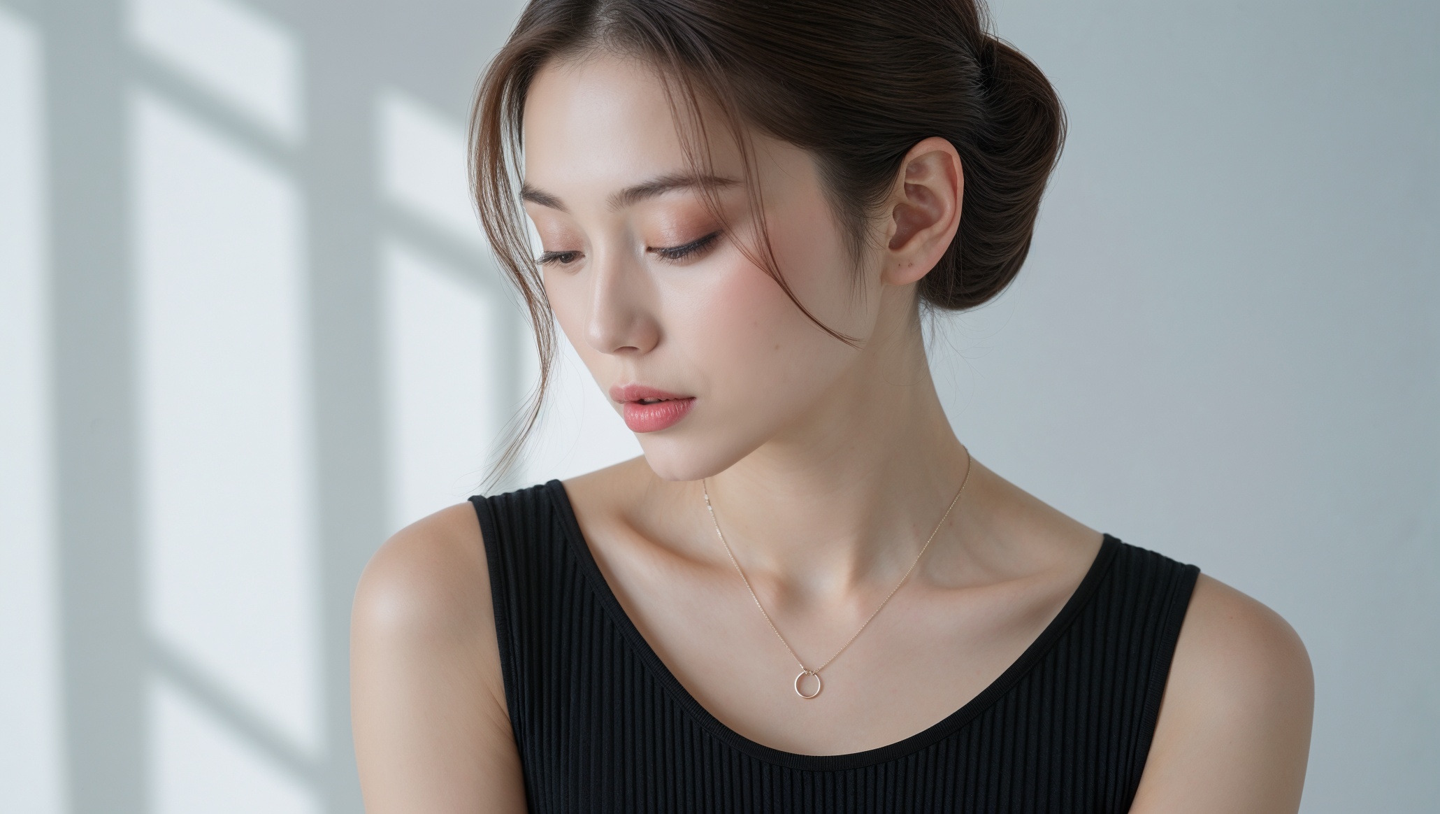 構図は彼女の上半身に焦点を当てており、柔らかな表情と、繊細なフリルが付いたノースリーブの黒いトップスという衣装の複雑なディテールが捉えられています。