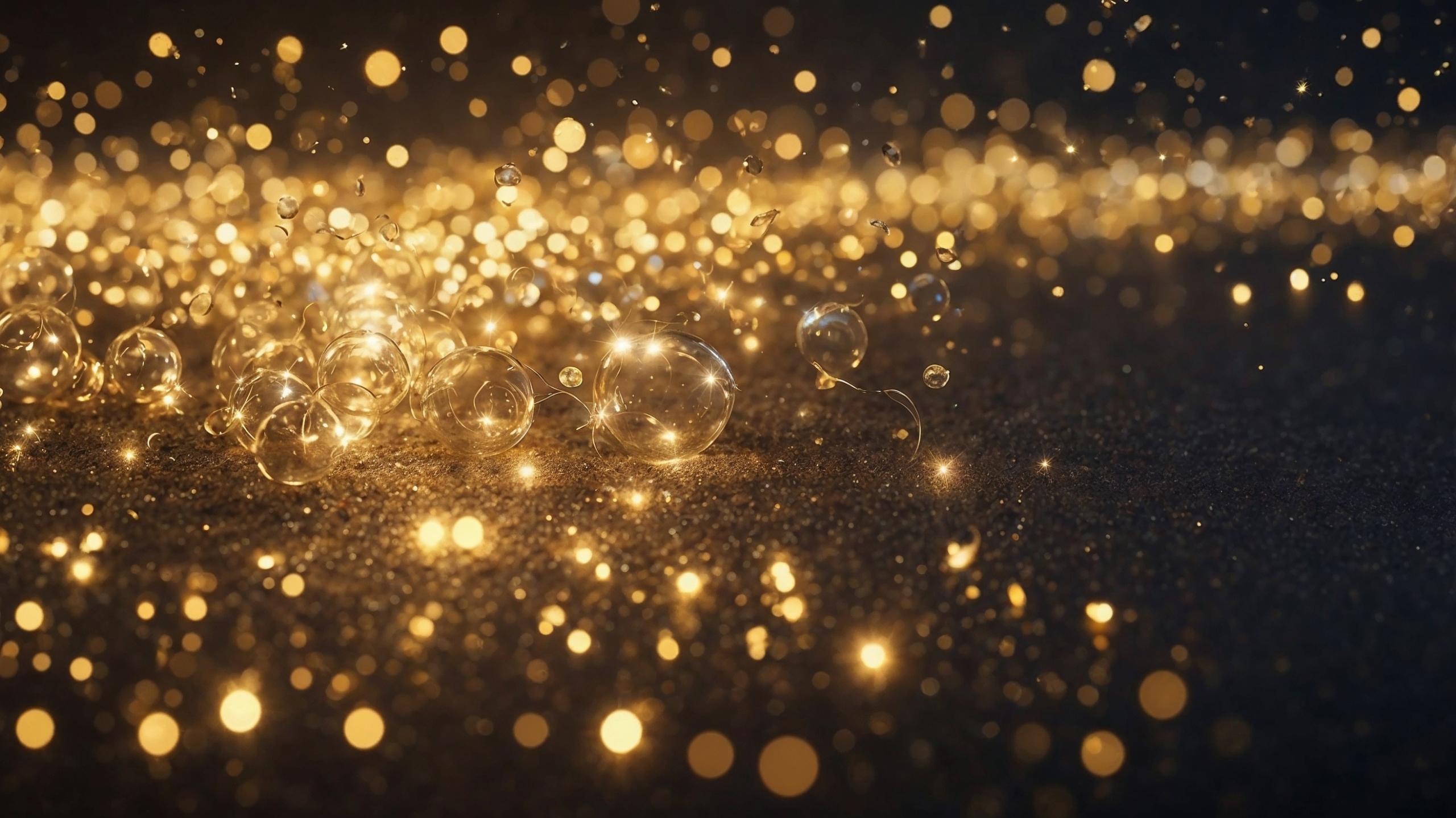 きらめく金色の輝きと幻想的な光の球体が透明な背景に散りばめられ、魔法のような魅惑的な雰囲気を醸し出しています。