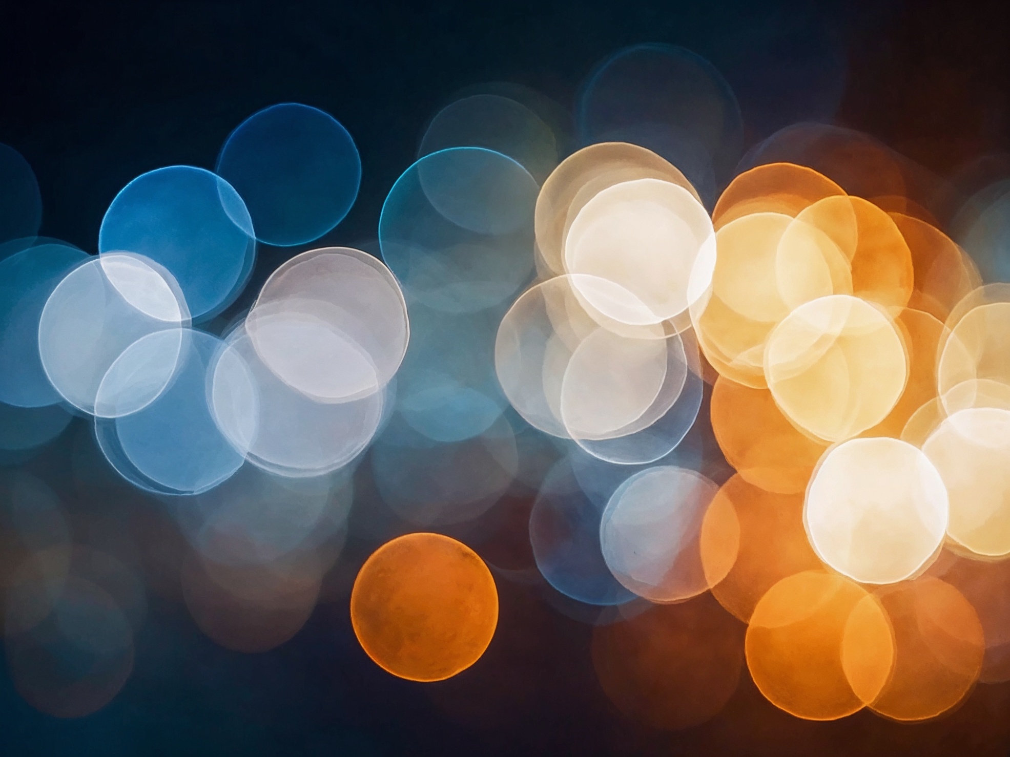 青、オレンジ、白の鮮やかな色合いで、柔らかく重なり合う光の輪が際立っています。