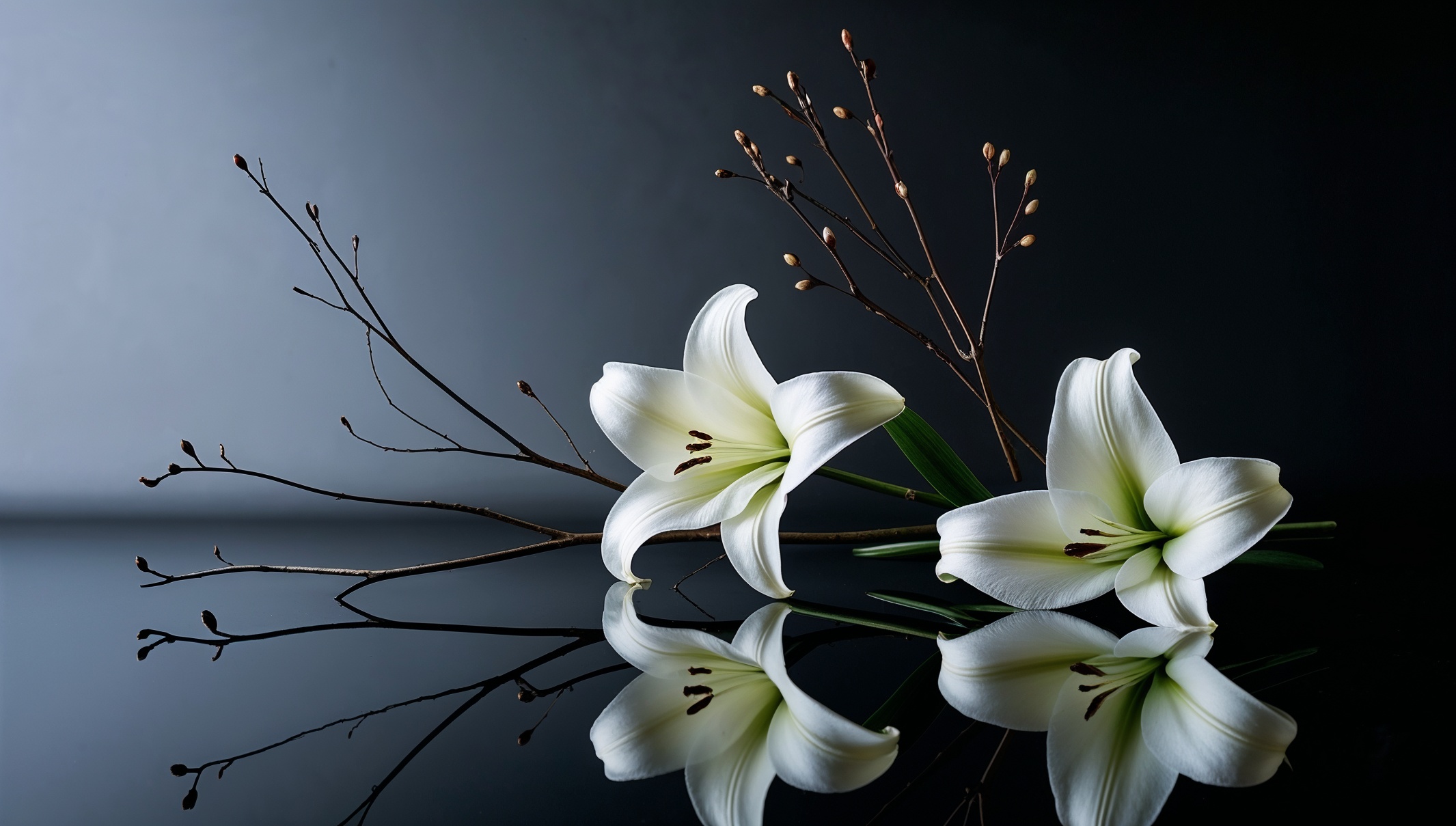 画像は、雄しべが目立つ2本の白いユリが、反射する黒い背景に優雅にアレンジされた静物写真です。