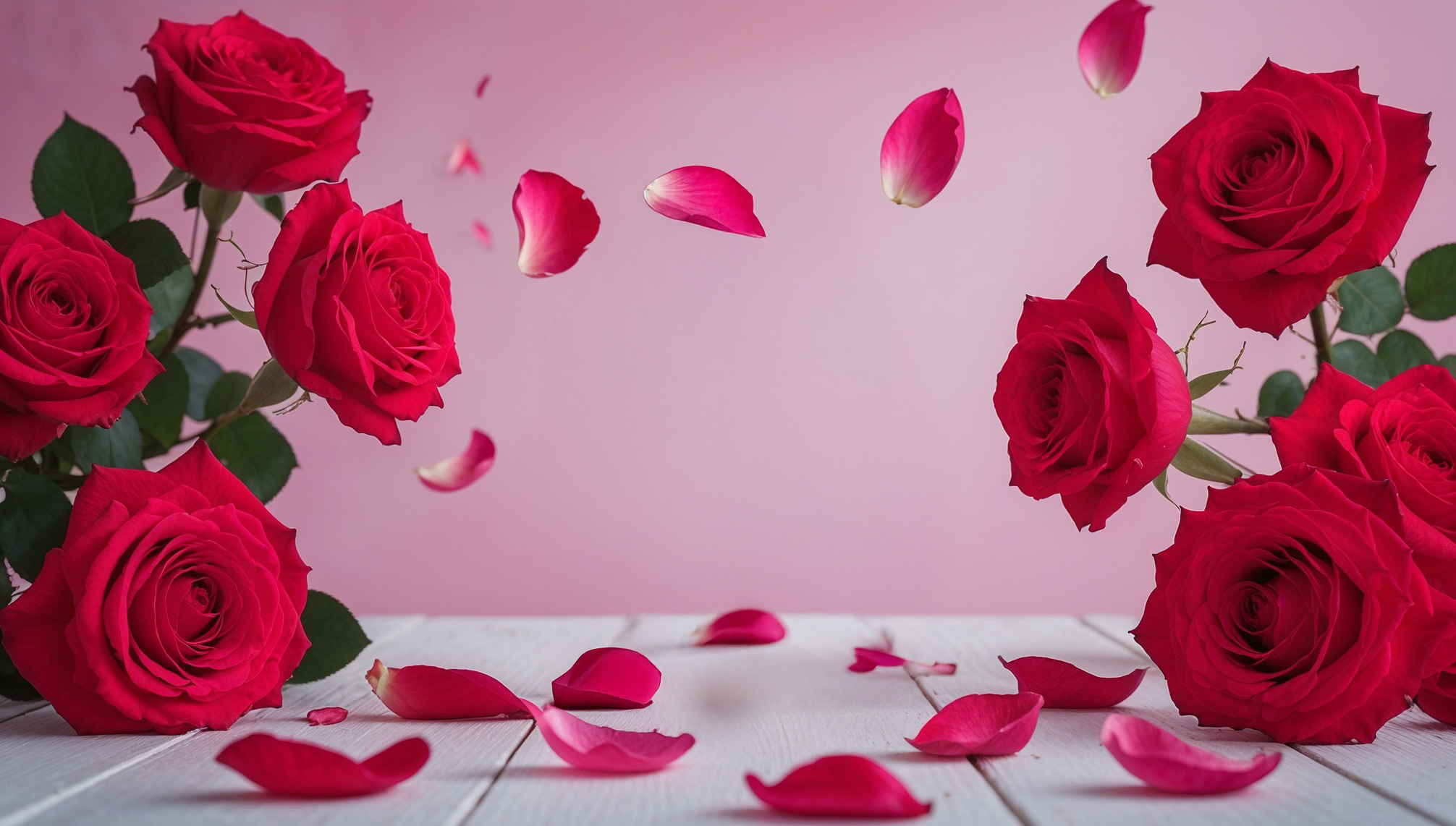 左右に2つのバラの花束が配置され、白い木製の表面に数枚の花びらが芸術的に散りばめられ、空中に浮かんでいることで、躍動感を演出しています。