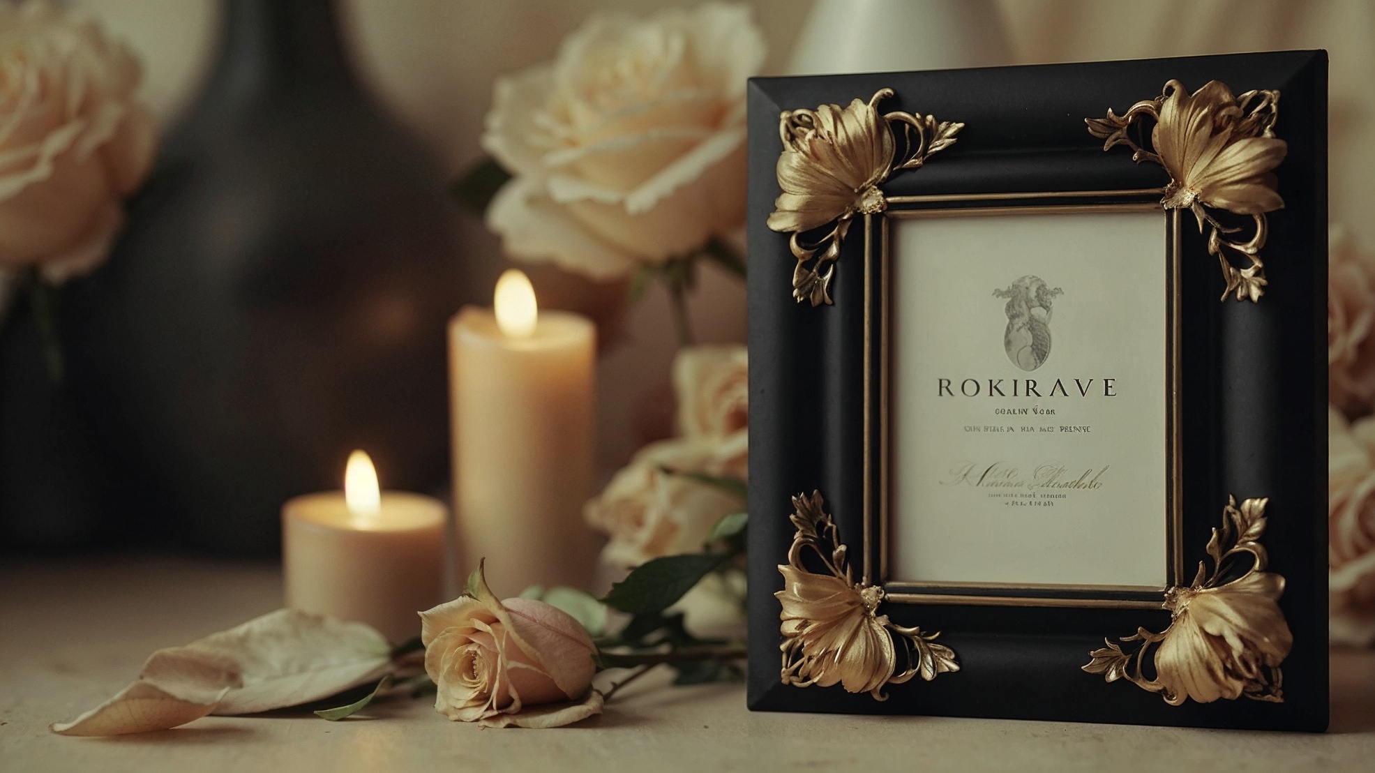 フレームは、柔らかい間接照明に囲まれた表面に置かれています。背景には、クリーム色のバラが数輪と、高さの異なる2本の灯ったキャンドルがあり、温かい光を放っています。