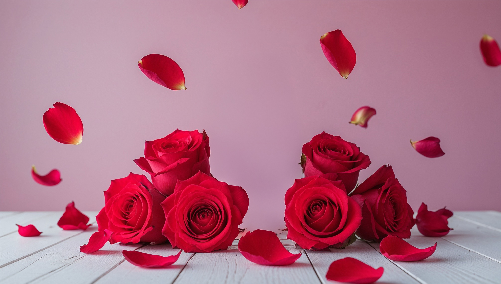 白い木製の台の上に、鮮やかな赤いバラの花束を2つ配置し、散らばった花びらが躍動感を添えています。