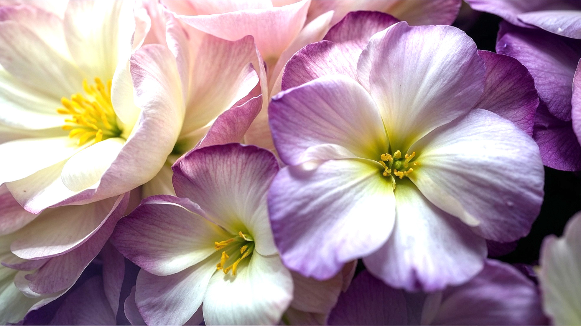 花が密集し、豊かで鮮やかな構図を作り出しています。それぞれの花の中心部には鮮やかな黄色の雄しべがはっきりと見え、花びらのパステルカラーと鮮やかなコントラストを添えています。