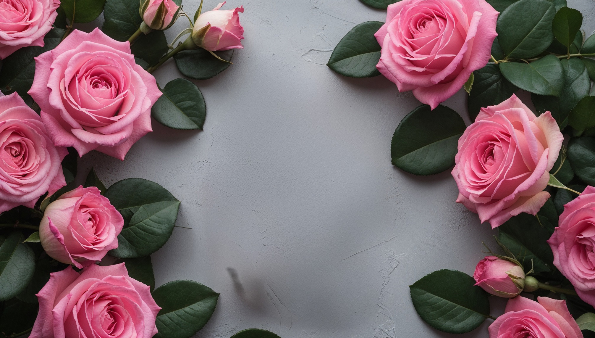 テクスチャ加工を施したグレーの背景に、ピンクのバラと緑の葉を対称的に配置した、花をテーマにしたレイアウトです。