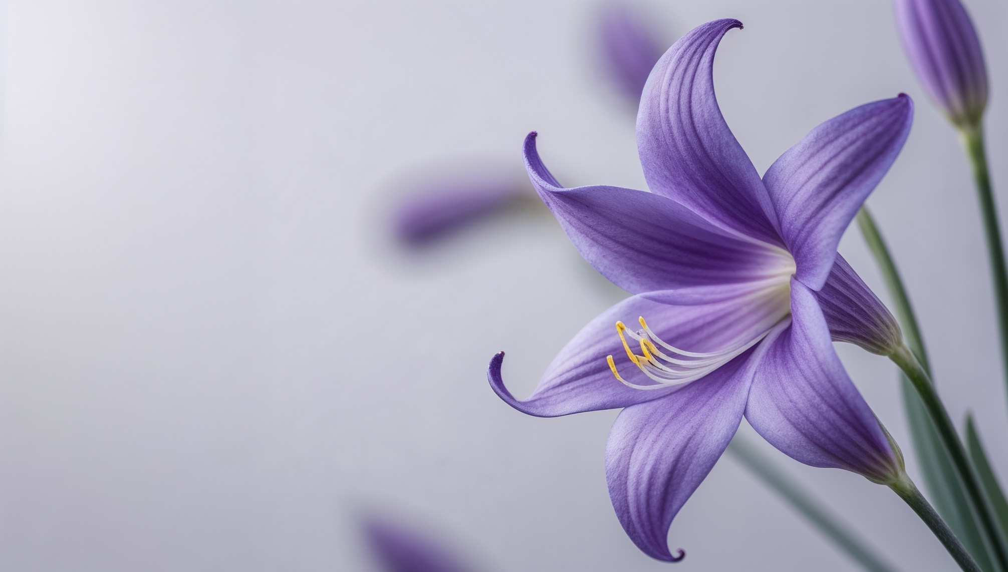 花はフレームの右側に位置し、花びらは優雅にカーブし、紫色のグラデーションを描いています。