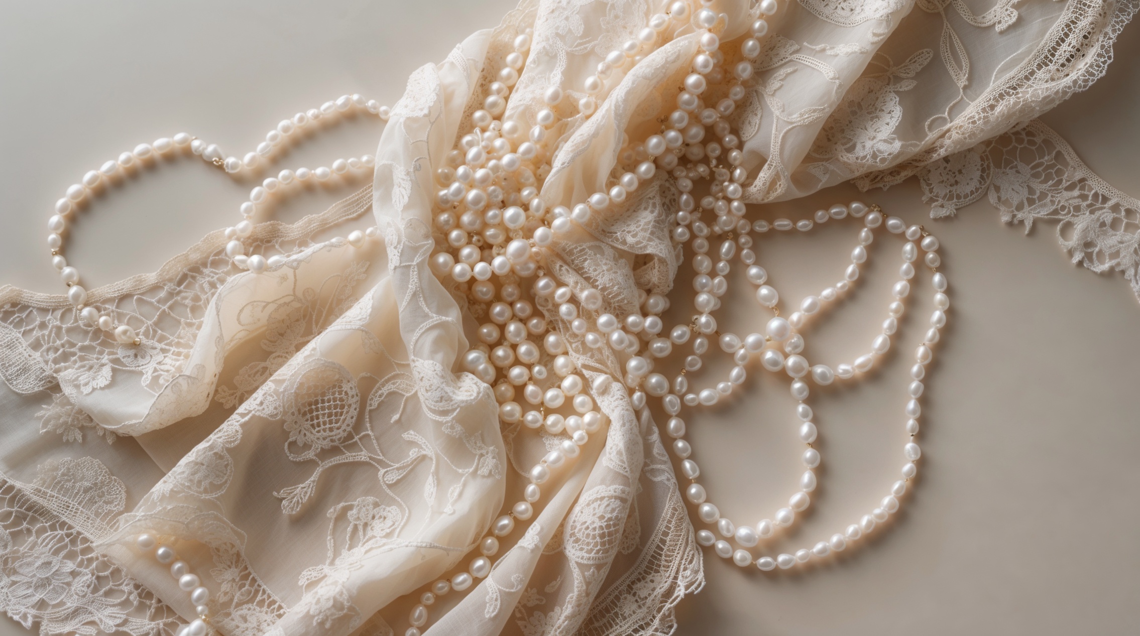 パールとレースは調和のとれた洗練されたビジュアルを生み出し、パールの光沢とレースのマットな質感が絶妙なコントラストを生み出しています。