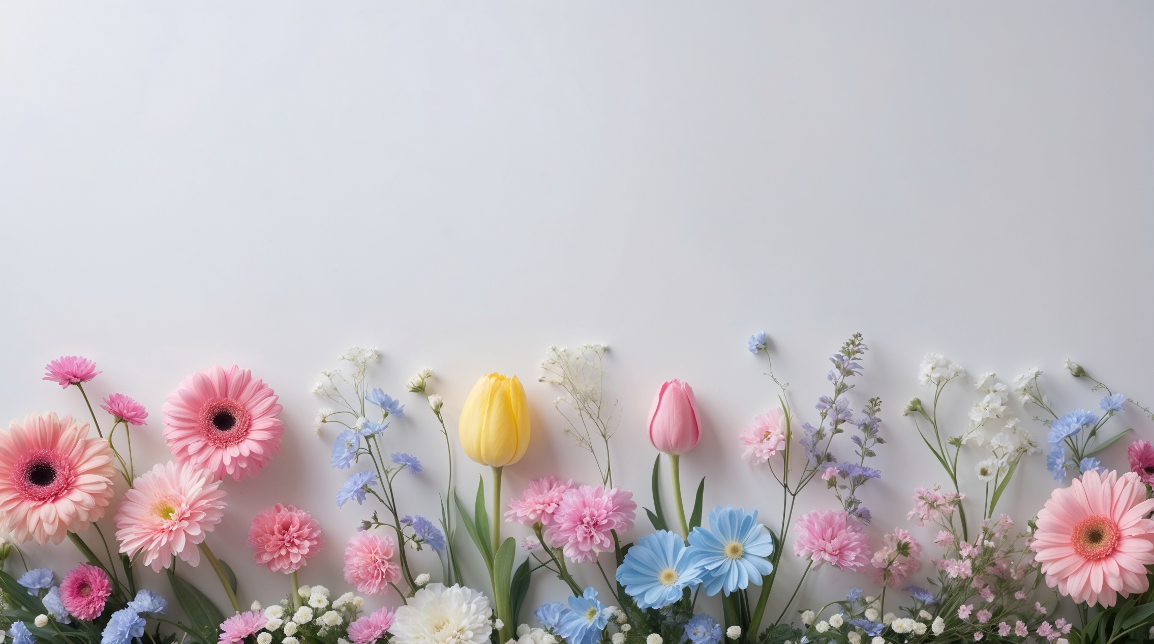 ピンクのガーベラ、黄色のチューリップ、ピンクのカーネーション、そして繊細な青と紫の花々が、小さな白い花と緑の葉と混ざり合っています。