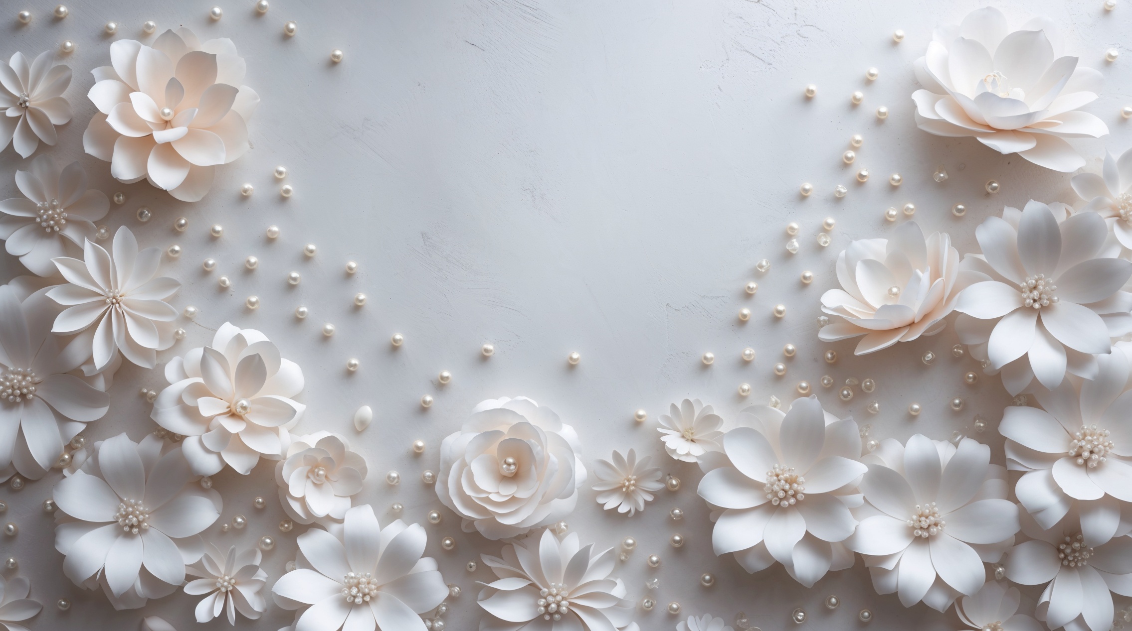 レイアウトは左右対称で、装飾要素は主に下半分に配置されています。被写体は、精巧な白い紙の花と、表面に散りばめられた小さな真珠のようなビーズで構成されています。