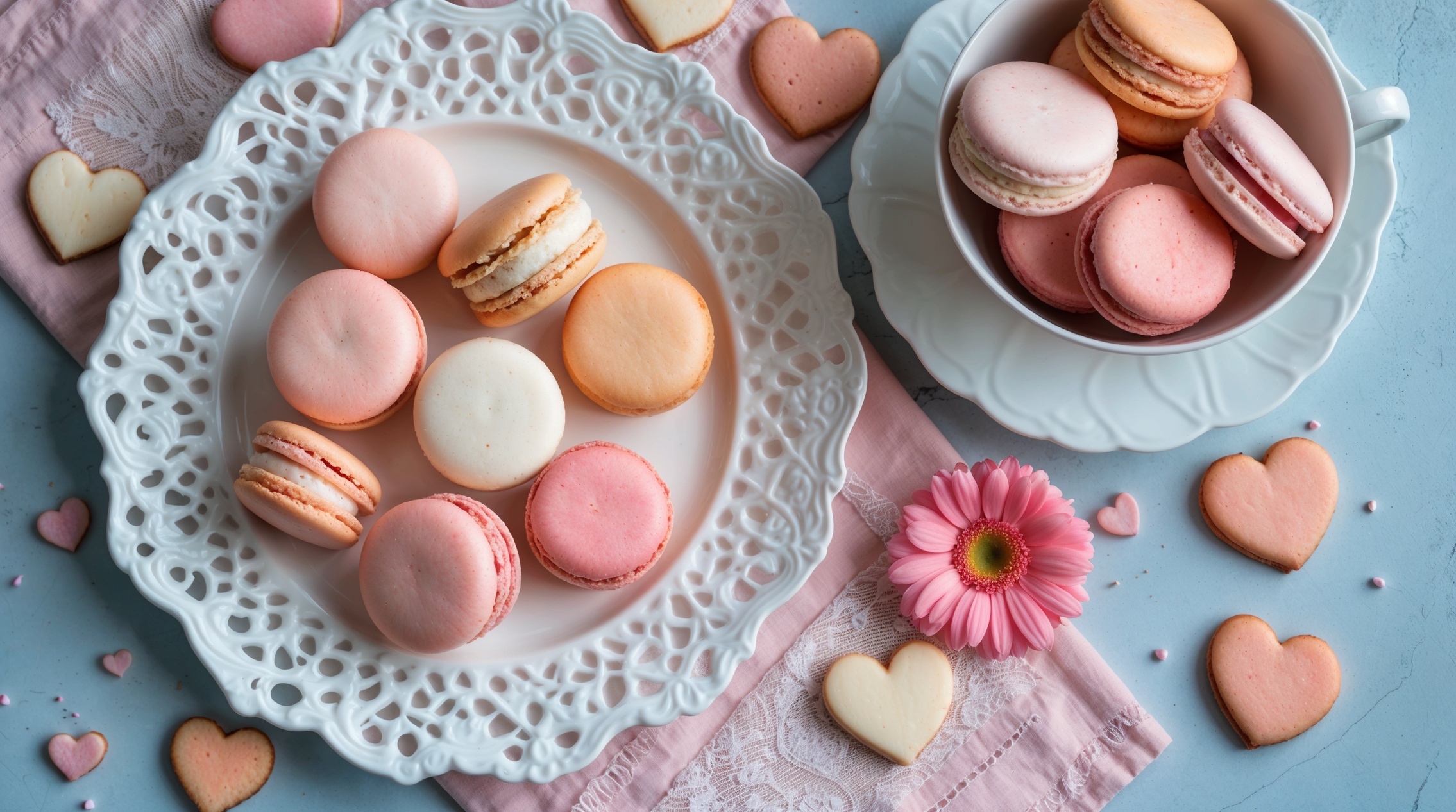 マカロンの色に合わせたハート型のクッキーが散りばめられ、ロマンチックで繊細な雰囲気を醸し出しています。